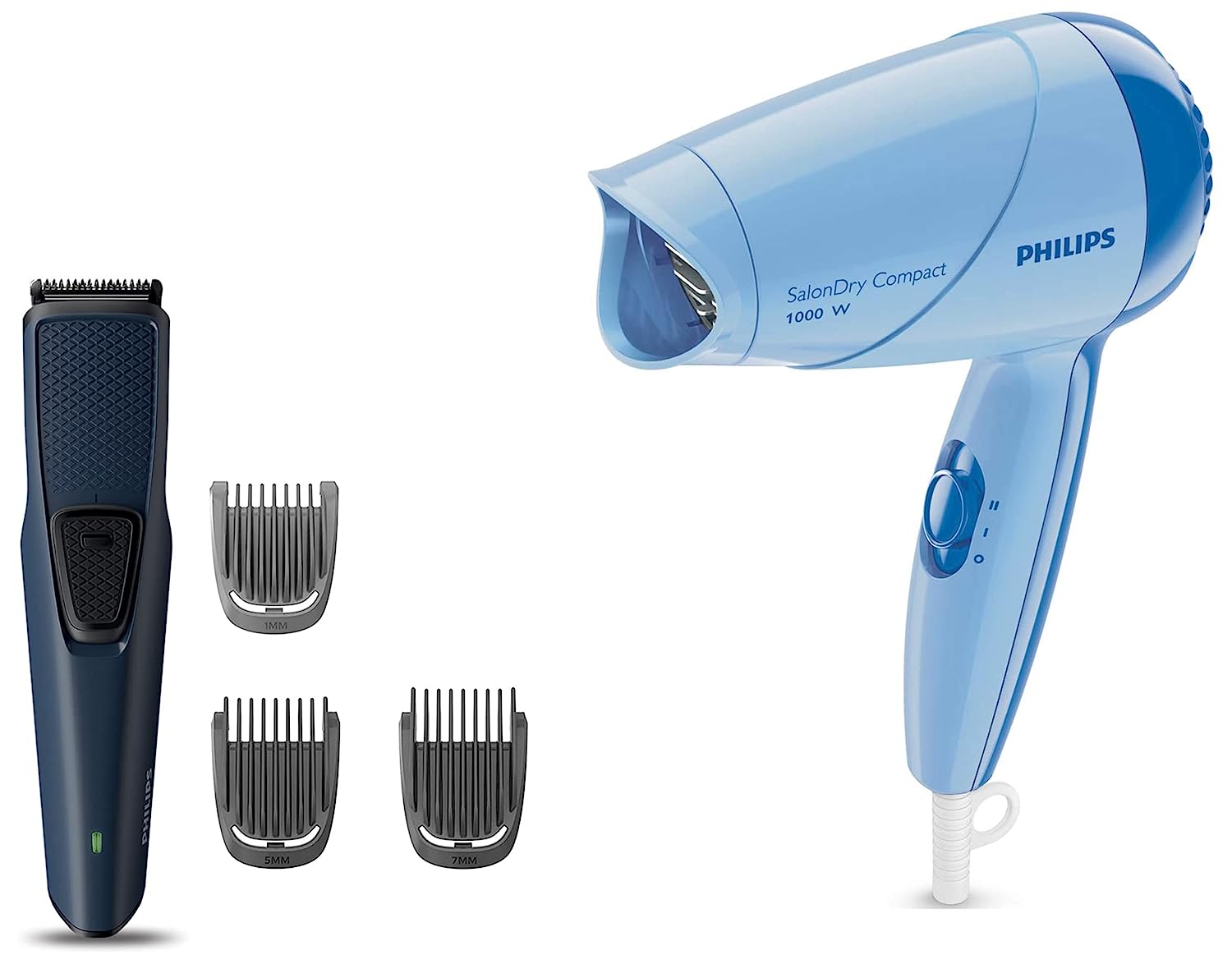 PHILIPS BT1232/15 Skin-friendly Beard Trimmer - DuraPower Technology, Cordless Rechargeable with USB Charging, Blue & Philips HP8100/60 Hair Dryer (Blue) - Men Grroming Combo