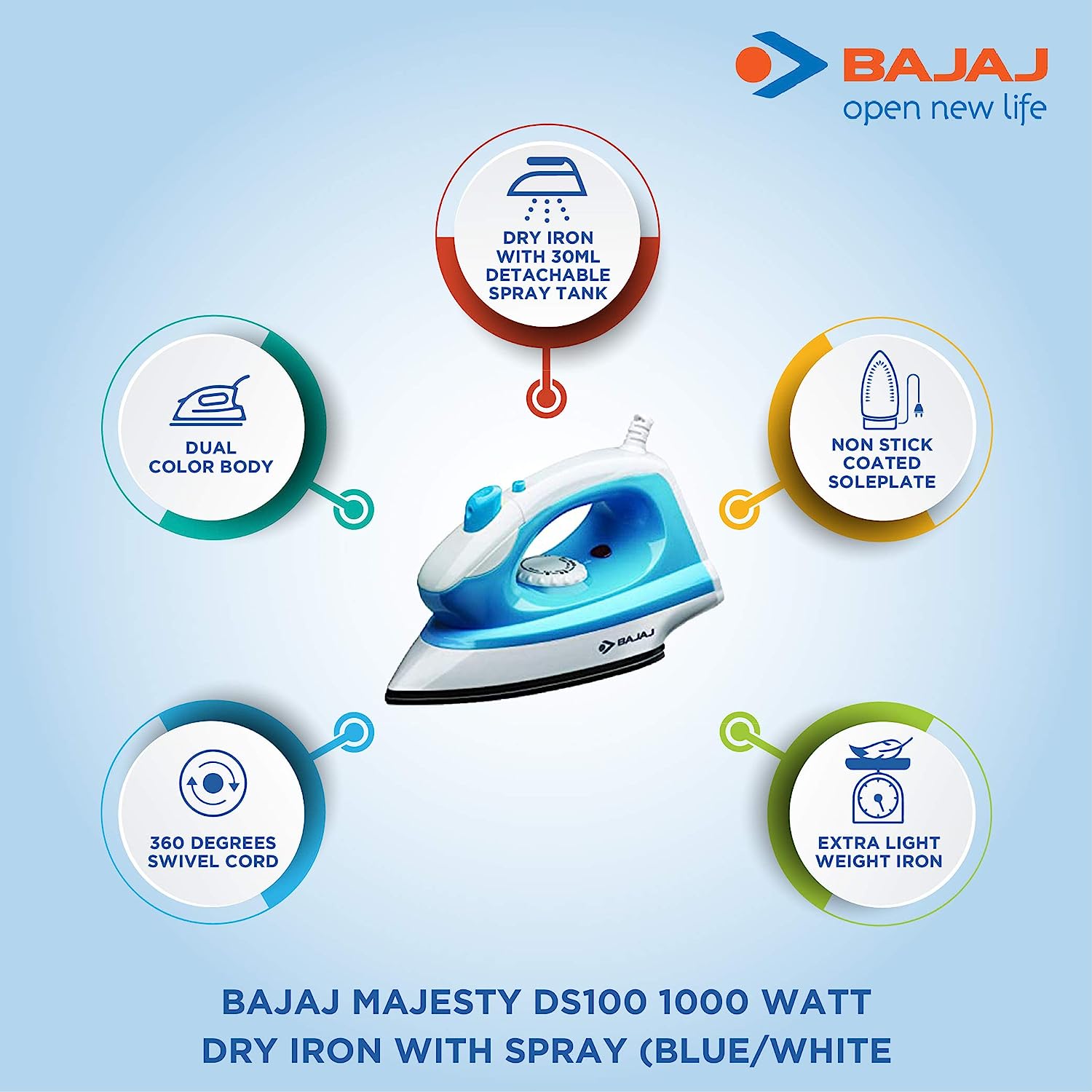 Bajaj Majesty DS100 1000 Watt Dry Iron with Spray (Blue/White)