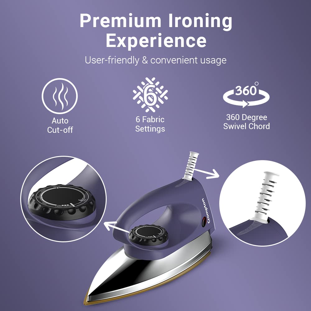 Crompton Greaves PREO 1000 Watt Light Weight Dry Iron with Golden Weilburger Coating, Purple, Small (ACGEI-PREO)
