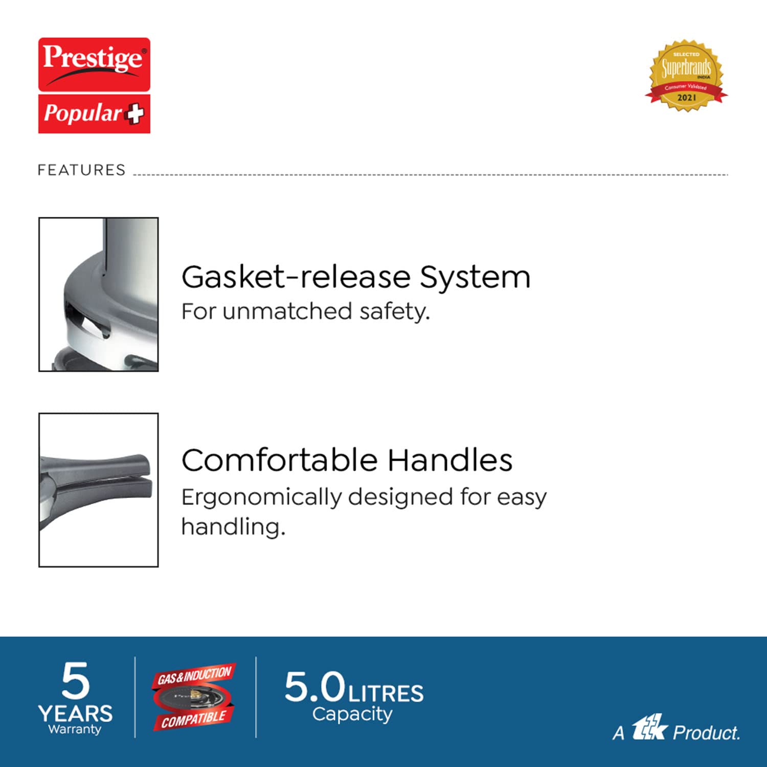 • BODY: Prestige Popular is an outer lid pressure cooker made from virgin aluminium which is light in weight and long lasting. The outer lid feature is suitable for both separator cooking and direct vessel cooking.