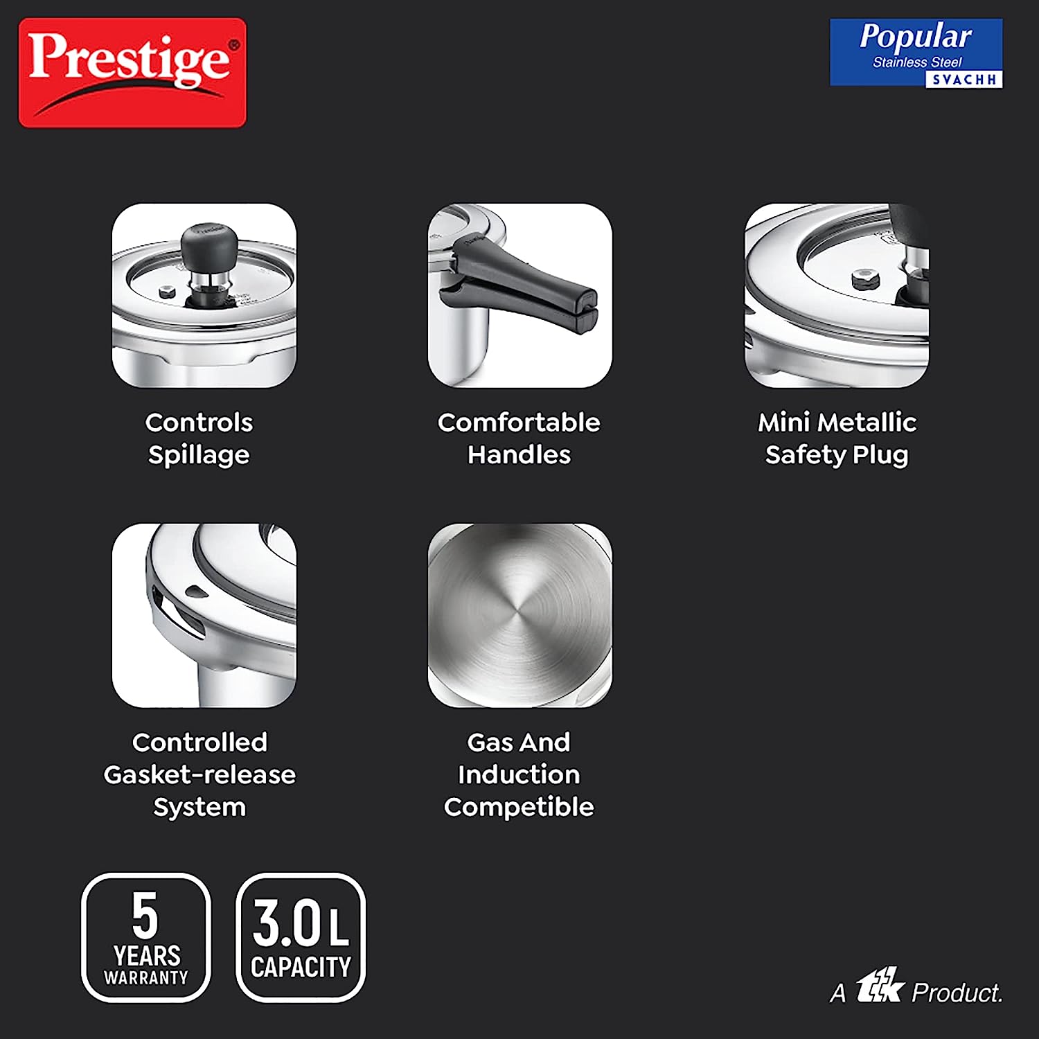 Prestige Popular Svachh Spillage Control Stainless Steel Outer Lid Pressure Cooker, 3 L (Silver)