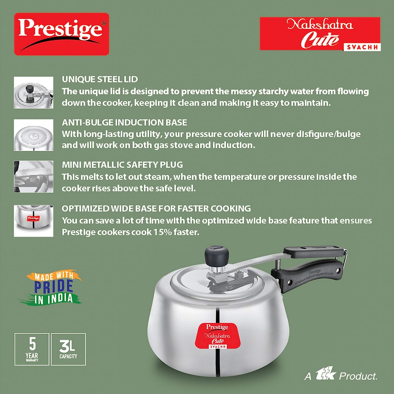 Prestige Nakshatra Cute Svachh Aluminium Inner Lid Pressure Cooker, 3.0L (Polished, Silver)