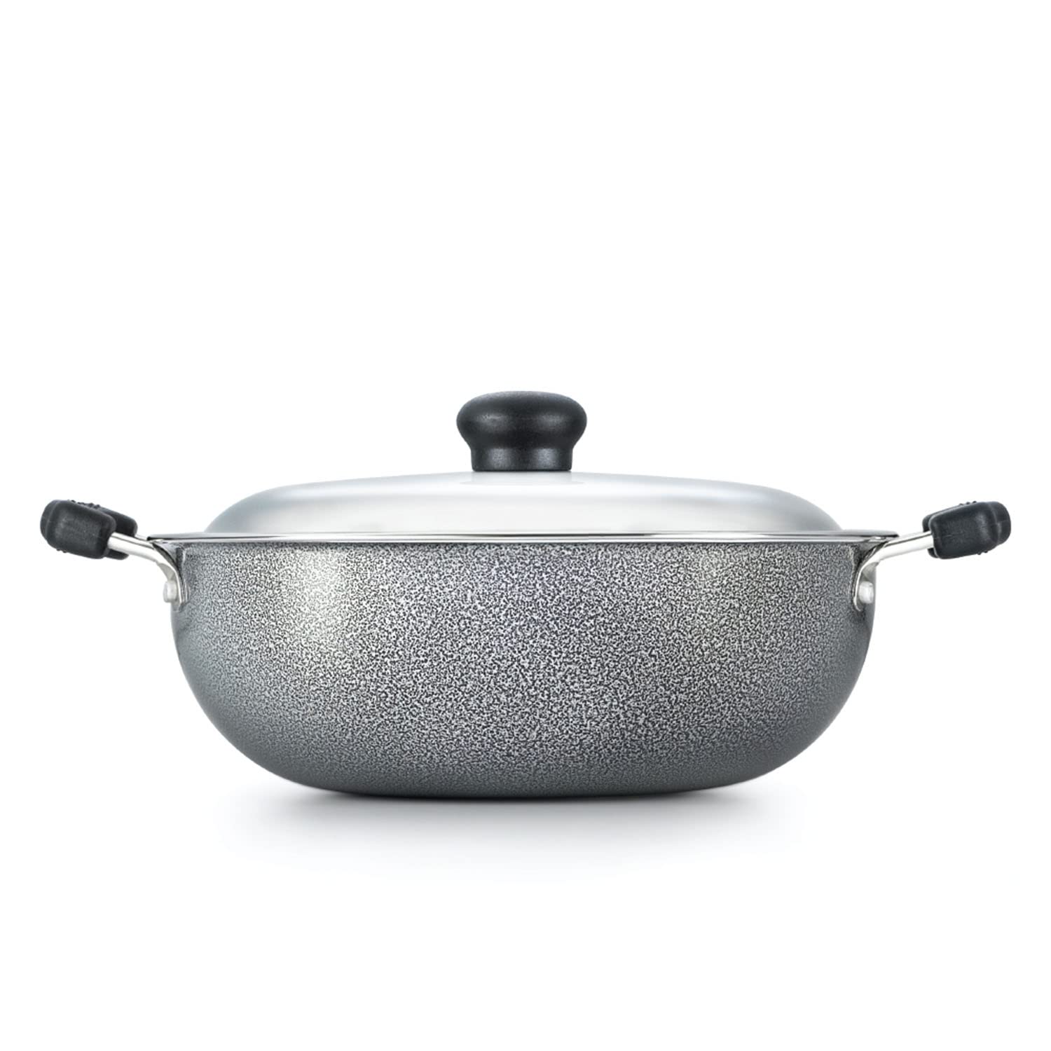 • Material: Non-stick Aluminium; Size: Round Base Kadai (17cm); Base type: Non Induction Base; Base thickness (in mm): 2.7; Included components: 1 Non-stick Round Base Kadai With Lid; Colour: Grey