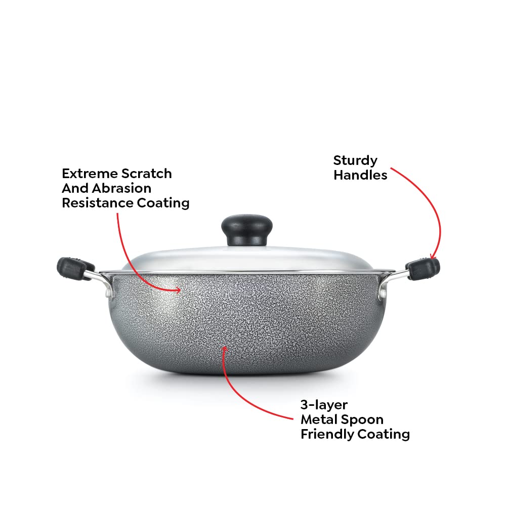 Prestige Aluminium Omega Select Plus Non-Stick Round Base Kadhai with Lid (Grey, 17cm)
