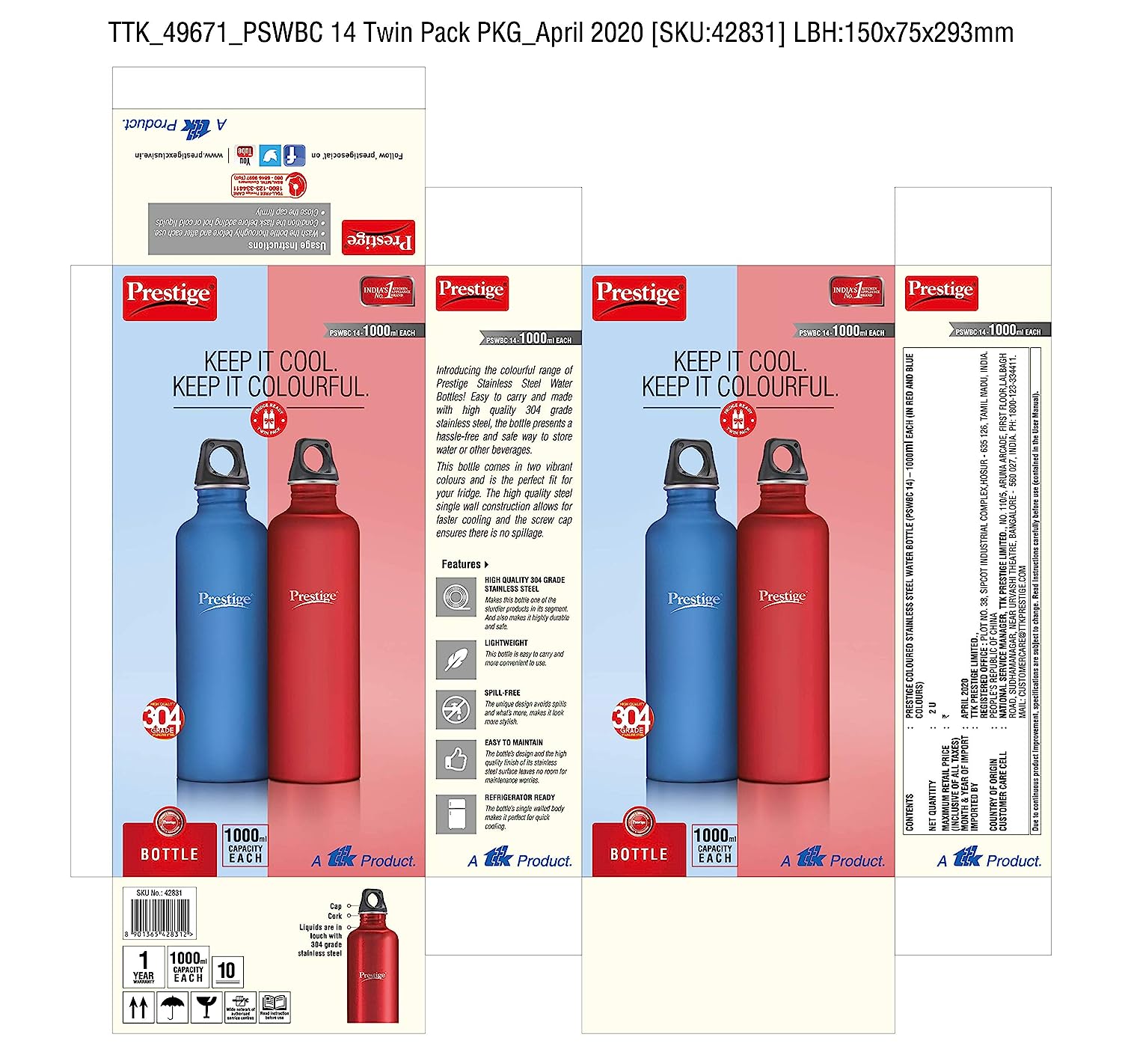 Prestige Colored Stainless Steel Water Bottle (pswbc 14) 1000 ml Each (Red, Blue, Pack of 1)