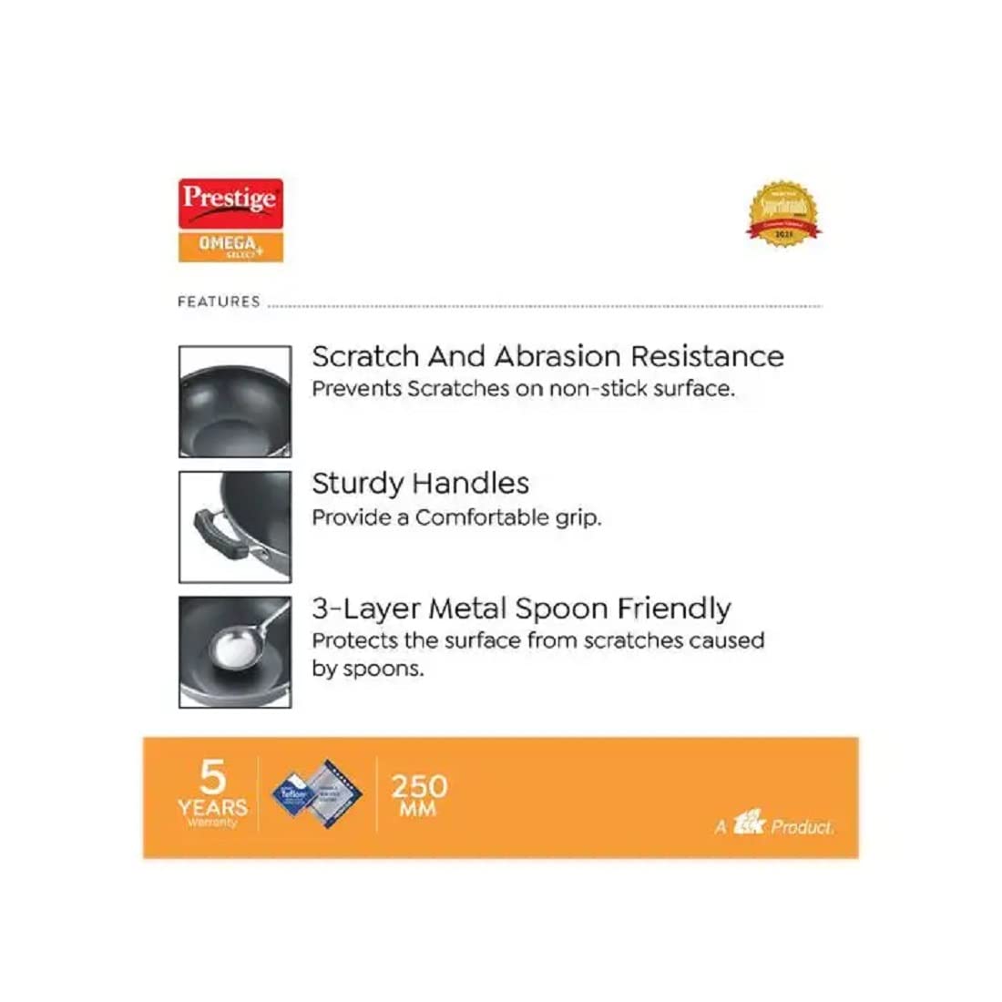 • METAL SPOON FRIENDLY Prestige Omega Select Plus Cookware comes with 3 layer Teflon non-stick residue free coating which not only uses less oil and also it is metal spoon friendly, thus making it healthier, user friendly and long lasting.