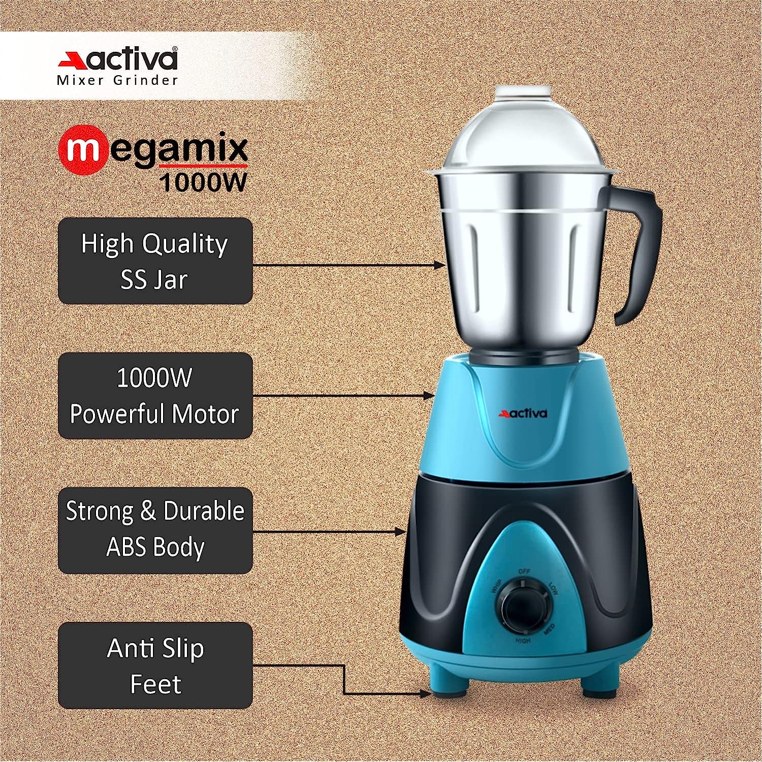 • EXTRA POWERFUL 1000 WATT MOTOR: New and powerful 1000 W Turbo Motor, with advanced air ventilation & sturdy couple. This ACTIVA Megamix Mixer Grinder Comprises of a Low-Maintenance And Really Powerful 1000 Watt Motor, Which Offers Seamless Trouble-Free Working For Several Years. The Motor is Strong For Top-Grade Grinding and Mixing of The Hardest Ingredients. The Switch Knobs Assist The User To Change The Speed Levels Without Any Fuss.