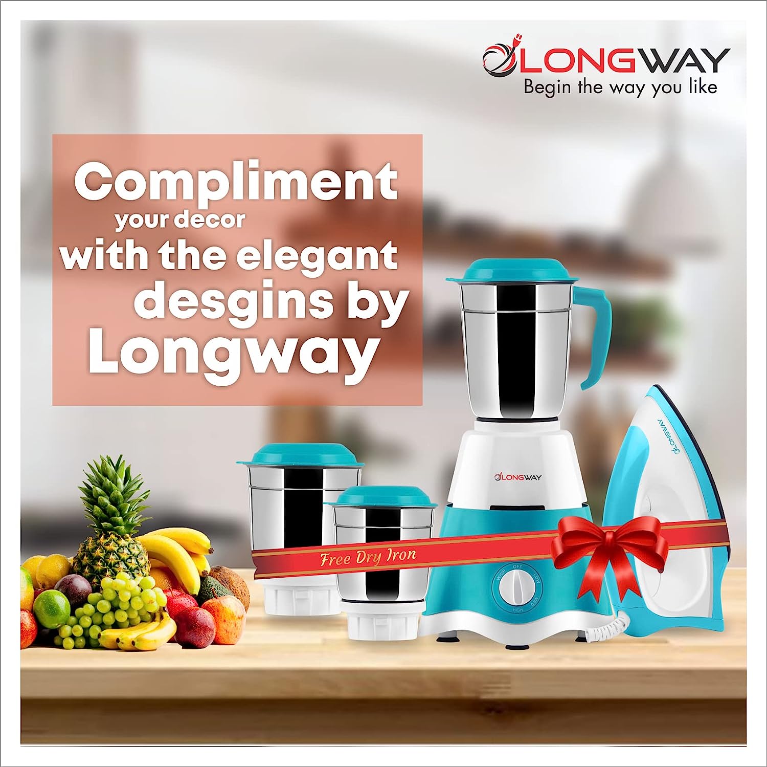 Longway Super Dlx 600 W Mixer Grinder (3 Jars) & Kwid 750 W Dry Iron (White & Blue)