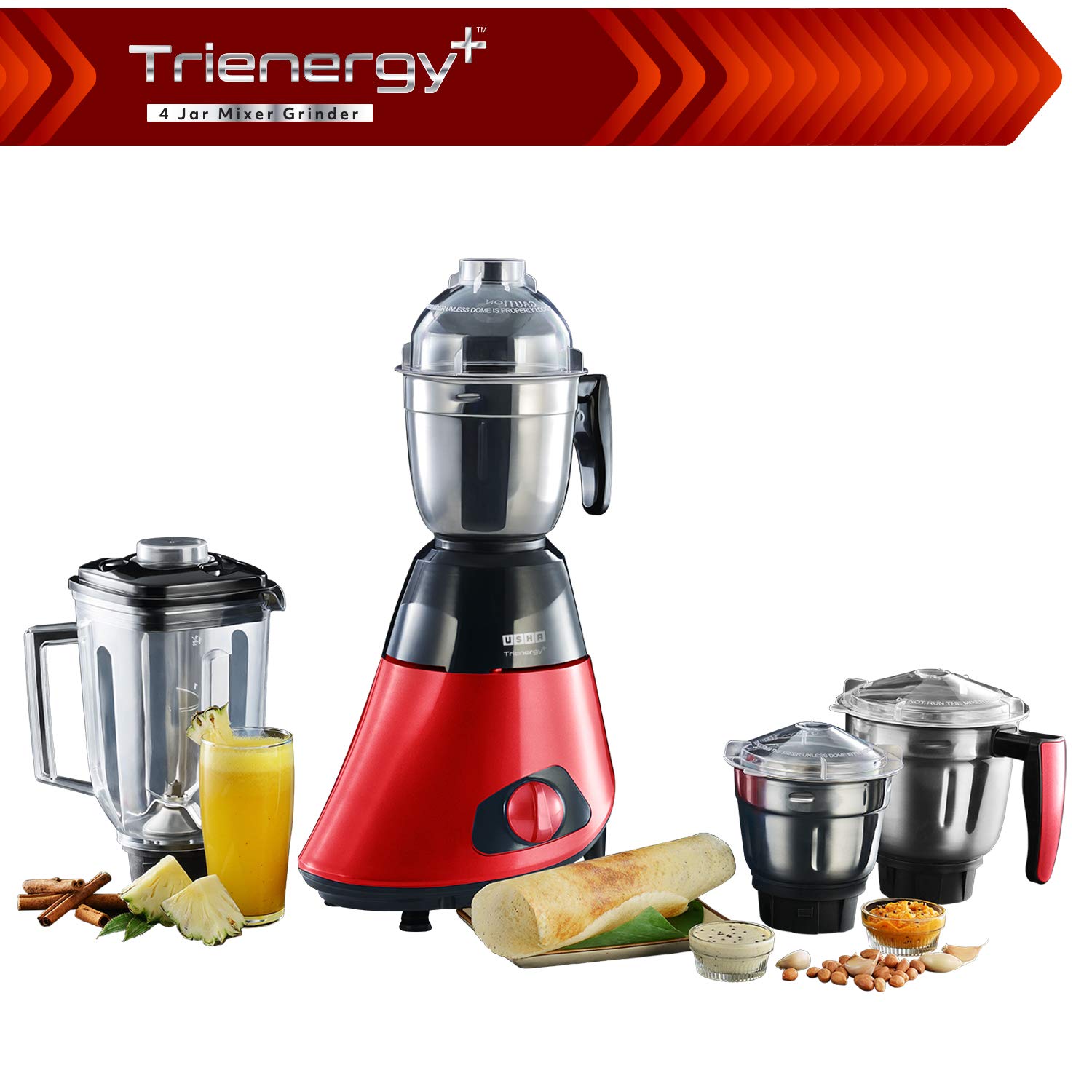 Usha Trienergy+ 800 Watt Powerful 100% Copper Motor 4 Jar Mixer Grinder with Unique QuadriFlow Square Blender Jar for Faster Grinding and Smooth Blending || 5 Years Warranty on Motor (Red)