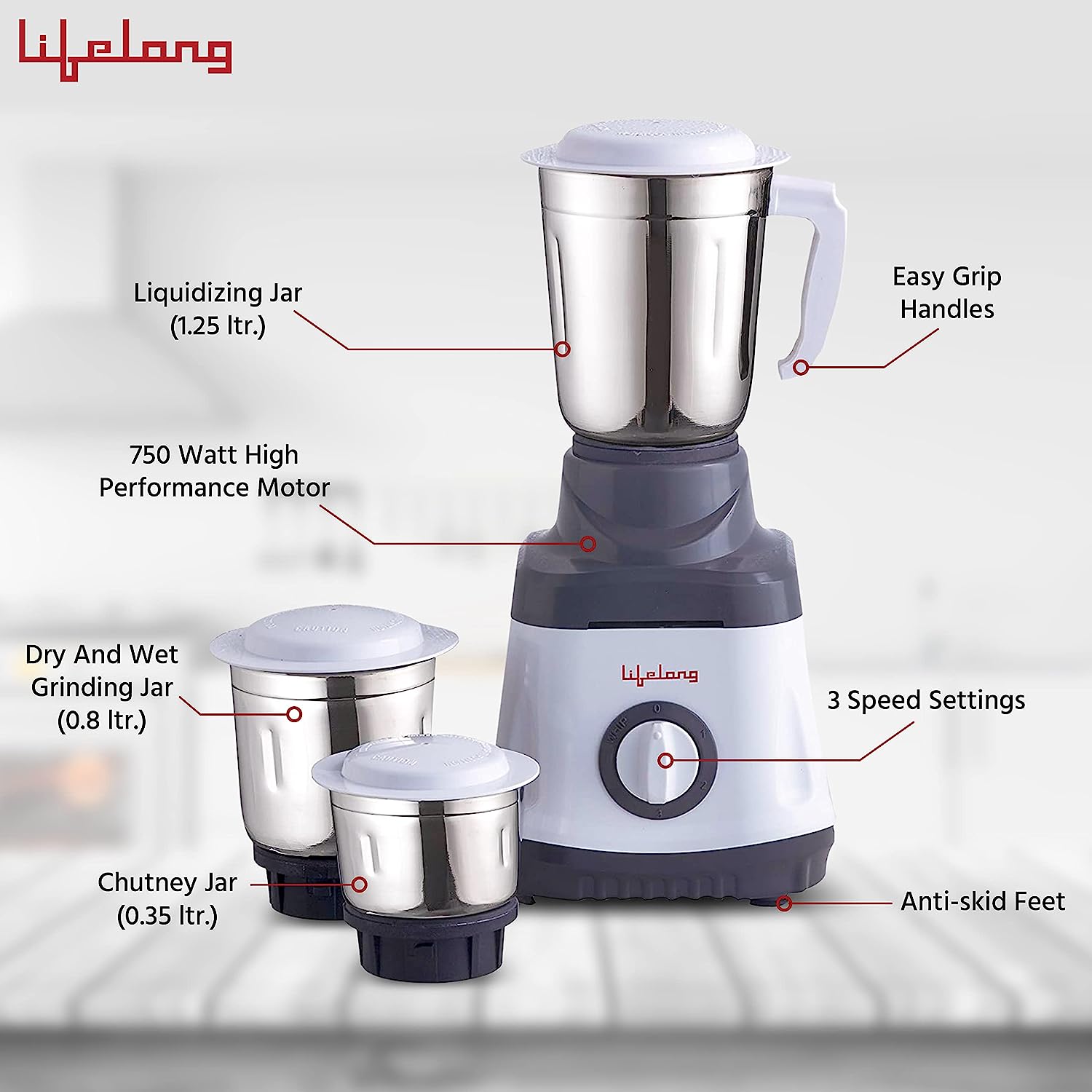 Lifelong LLMG74 750 Watt Mixer Grinder with 3 Jars (White and Grey)
