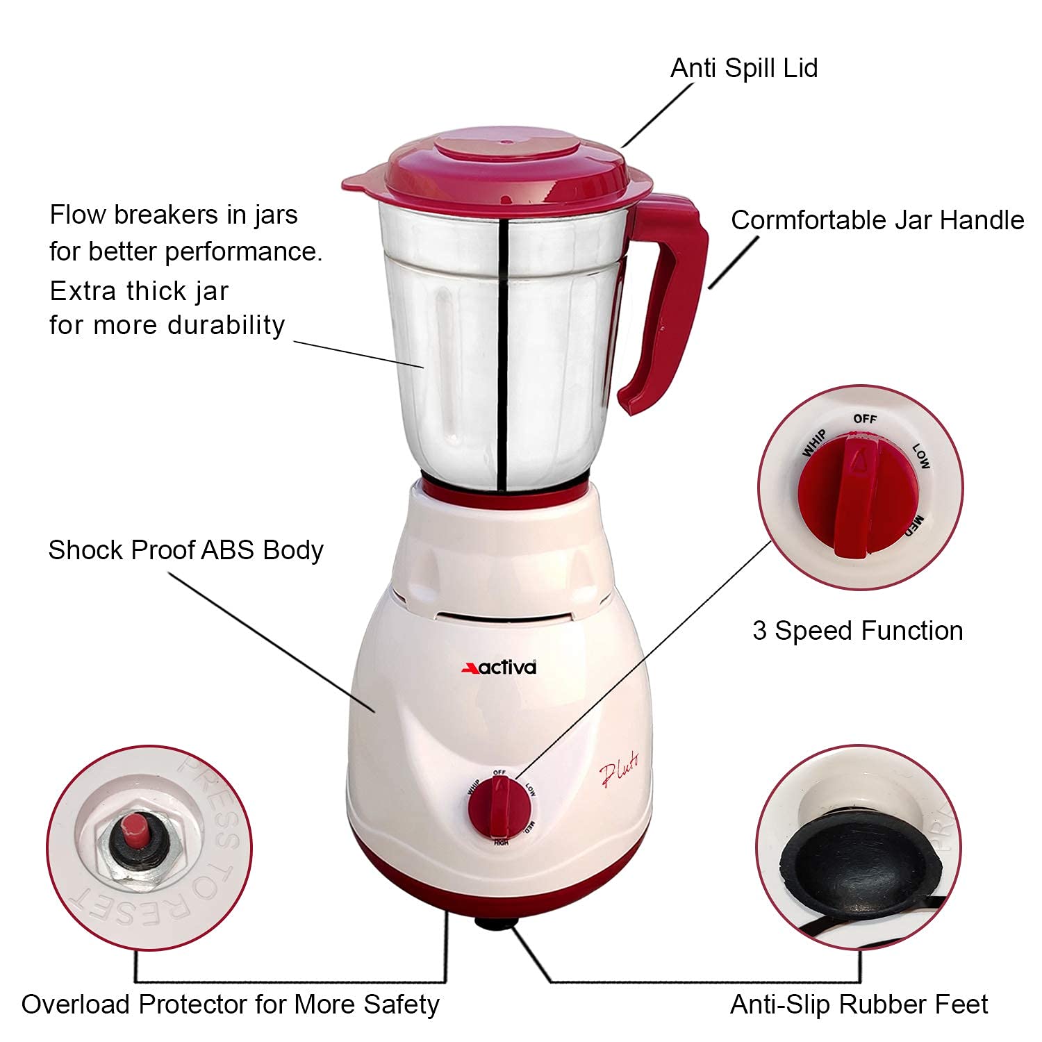 • POWERFUL 500 WATT MOTOR: ACTIVA Pluto Mixer Grinder Comprises of a Low-Maintenance And Really Powerful 500 Watt Motor, Which Offers Seamless Trouble-Free Working For Several Years. The Motor is Strong For Top-Grade Grinding and Mixing of The Hardest Ingredients. The Switch Knobs Assist The User To Change The Speed Levels Without Any Fuss.