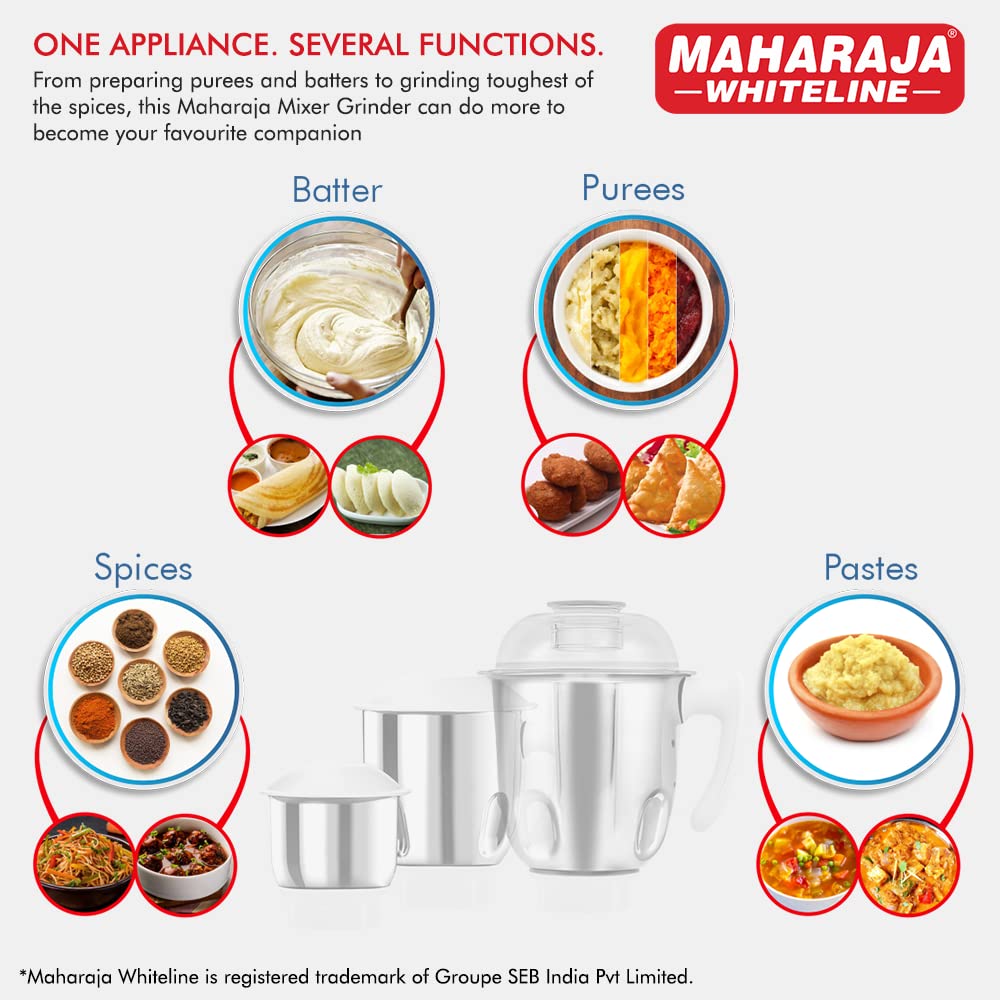 • Includes: 1 Mixer, 1 Wet Stainless Steel Jars (1.5L), 1 Grinding Stainless Steel Jar (1L), 1 Stainless Steel Chutney Jar (0.4L), User Manual, 1 Spatula
