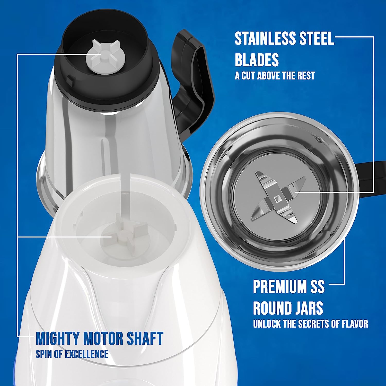 • DURABLE CONSTRUCTION - The mixer grinder is built to withstand the rigors of a busy kitchen. It features sturdy construction with upgraded-quality materials that ensure durability and longevity. The stainless steel jars are corrosion-resistant, ensuring they remain in good condition even with regular use.