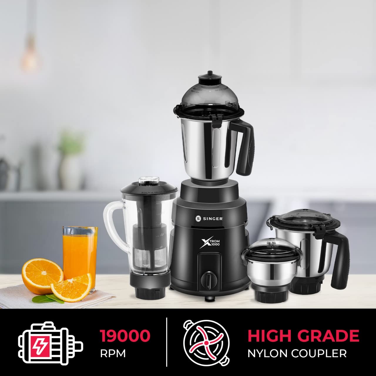 Singer Xtrom Mixer Grinder 1000 Watts 4 Jar includes 3 Stainless Steel Jar, 1 Transparent Jar with Fruit Filter - Black