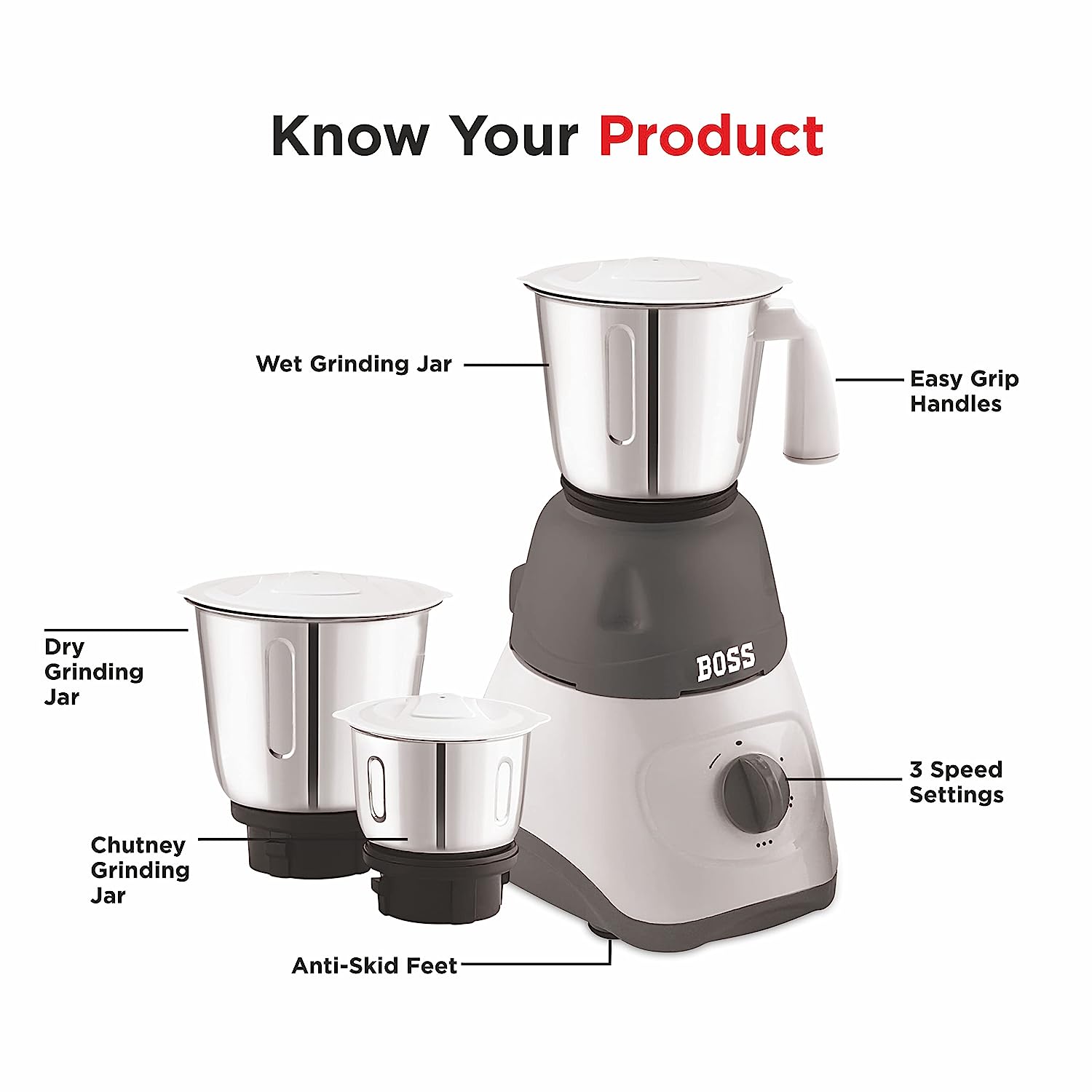 BOSS E205 500-Watt Mixer Grinder, 3 Jars, Grey