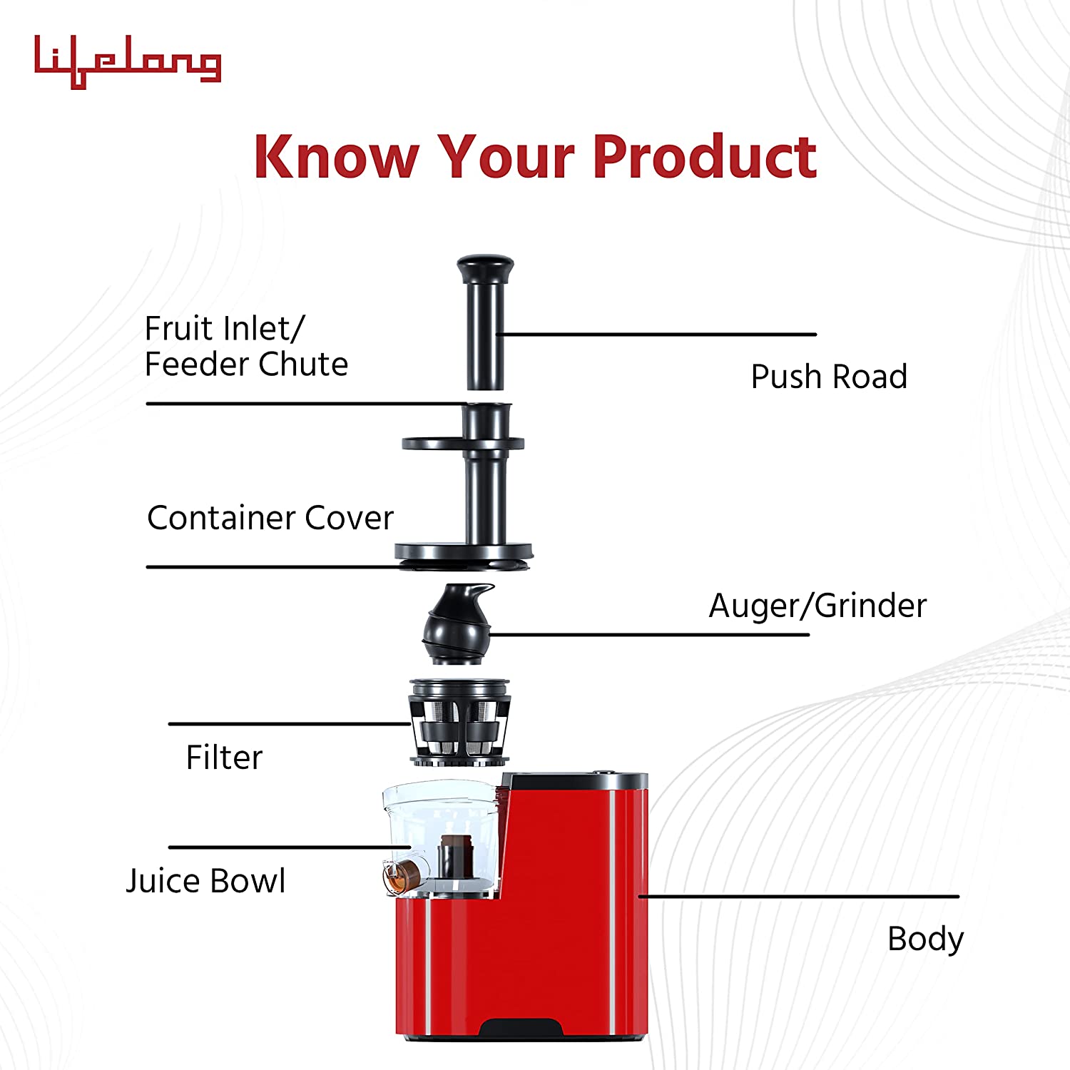 • Lifelong Mach Cold Press Slow Juicer comes equipped with 180W motor so that any ingredient you put in the machine is given proper time for extracting juice fully.