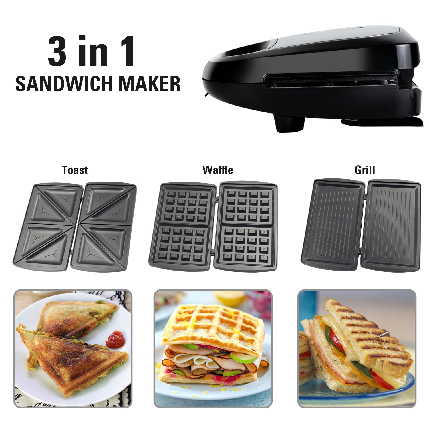 iBELL SM1301 3-in-1 Sandwich Maker with Detachable Plates for Toast/Waffle/Grill, 750 Watt (Black)