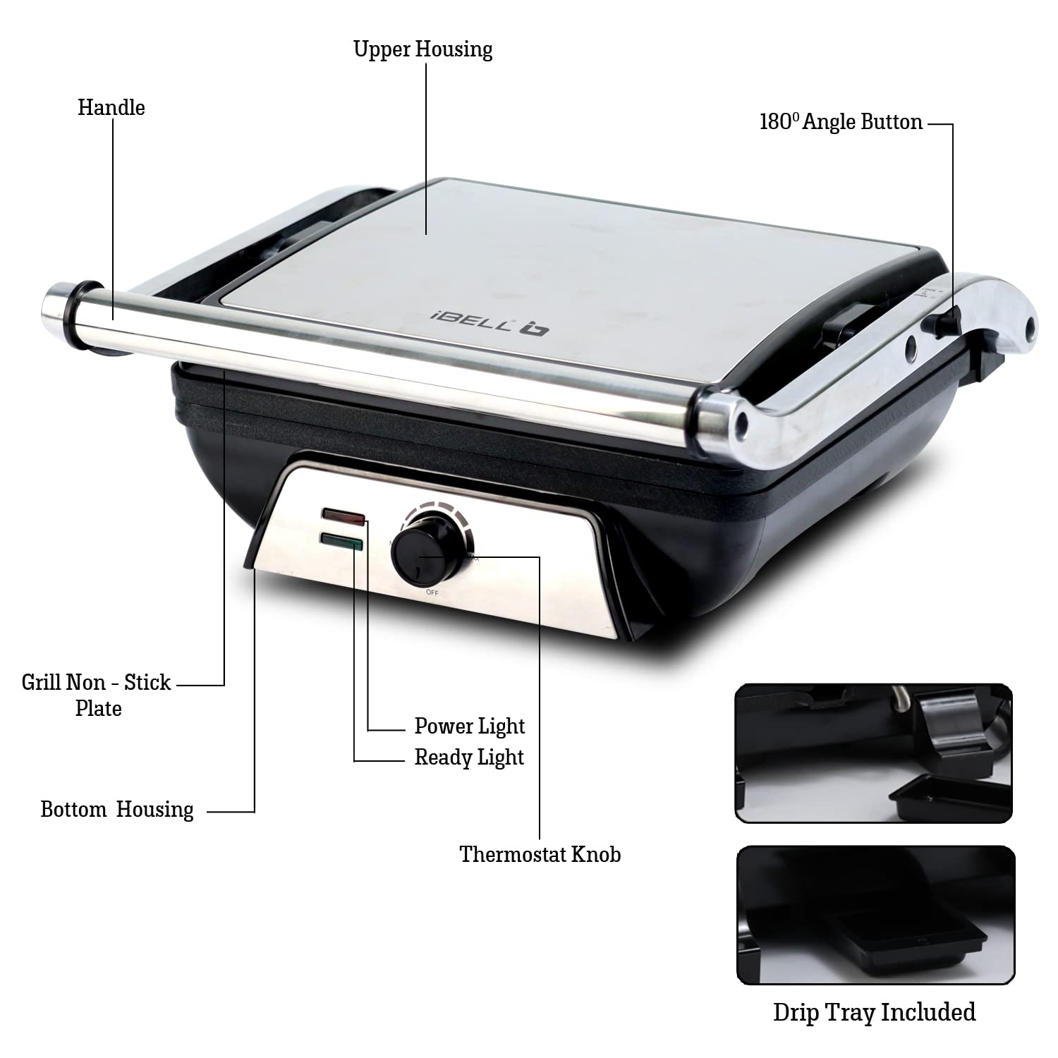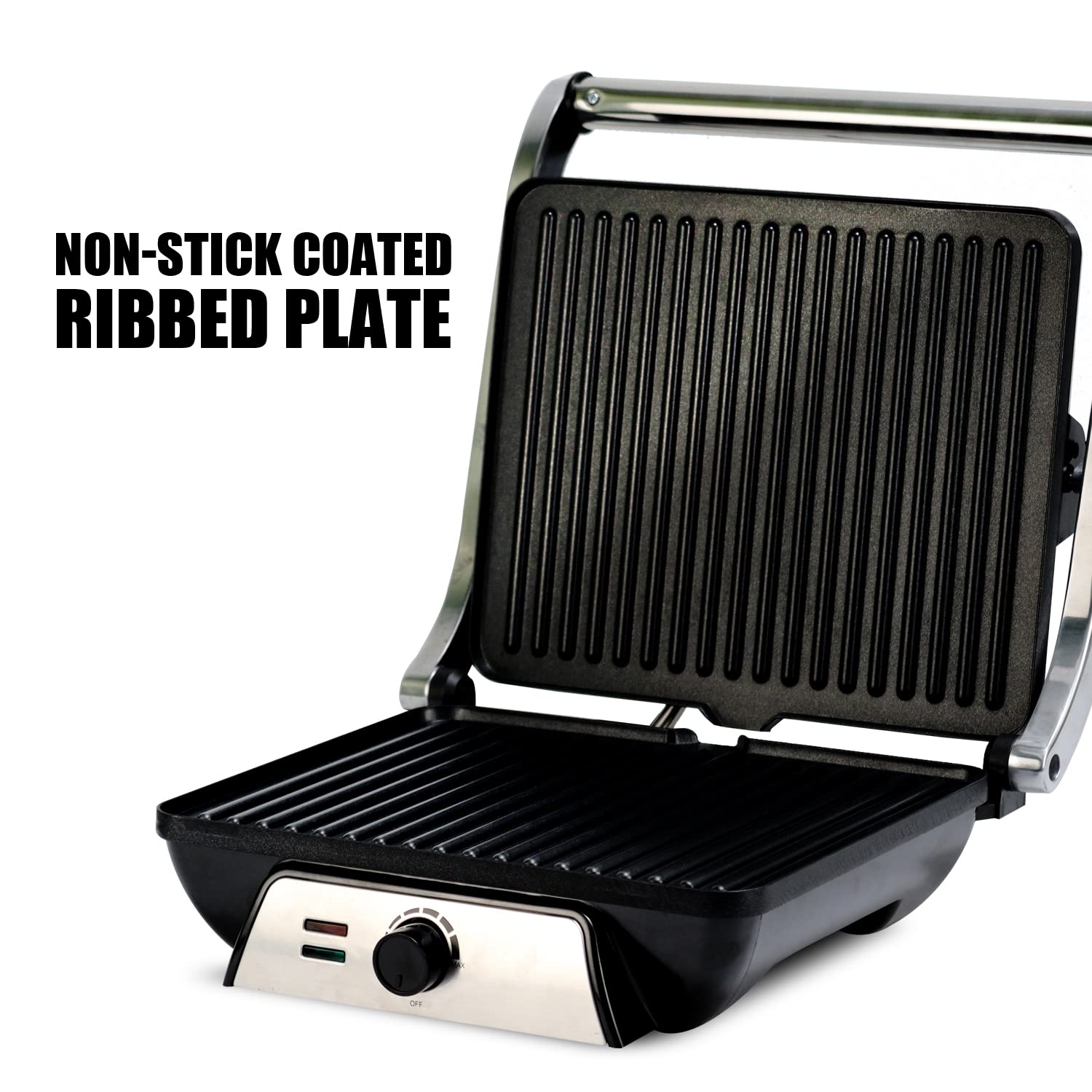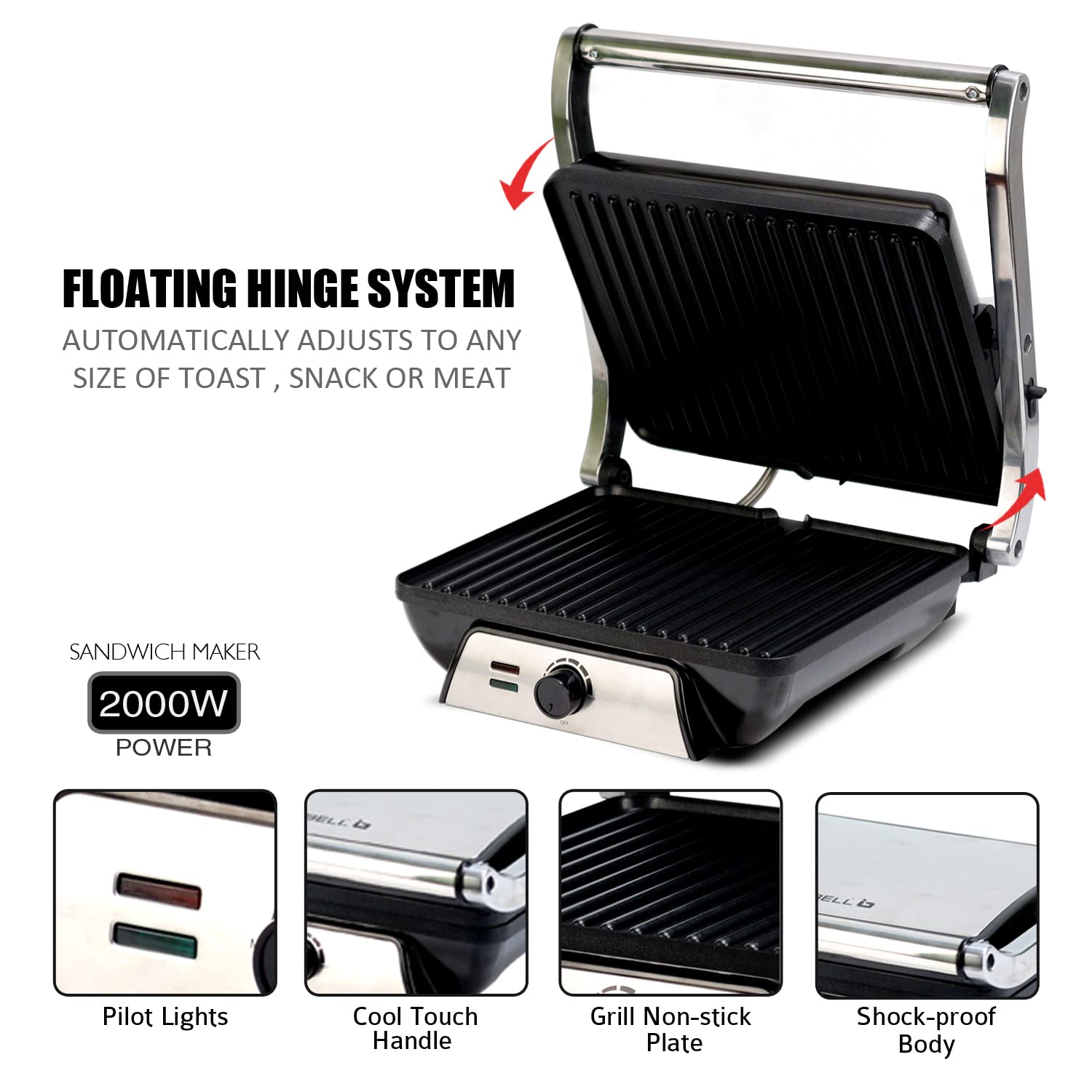 iBELL SM1201G Sandwich Maker Grill and Toast Electric, 2000W, Big Size Fits 4 Bread Slices, Thermostat Knob (Silver with Black)