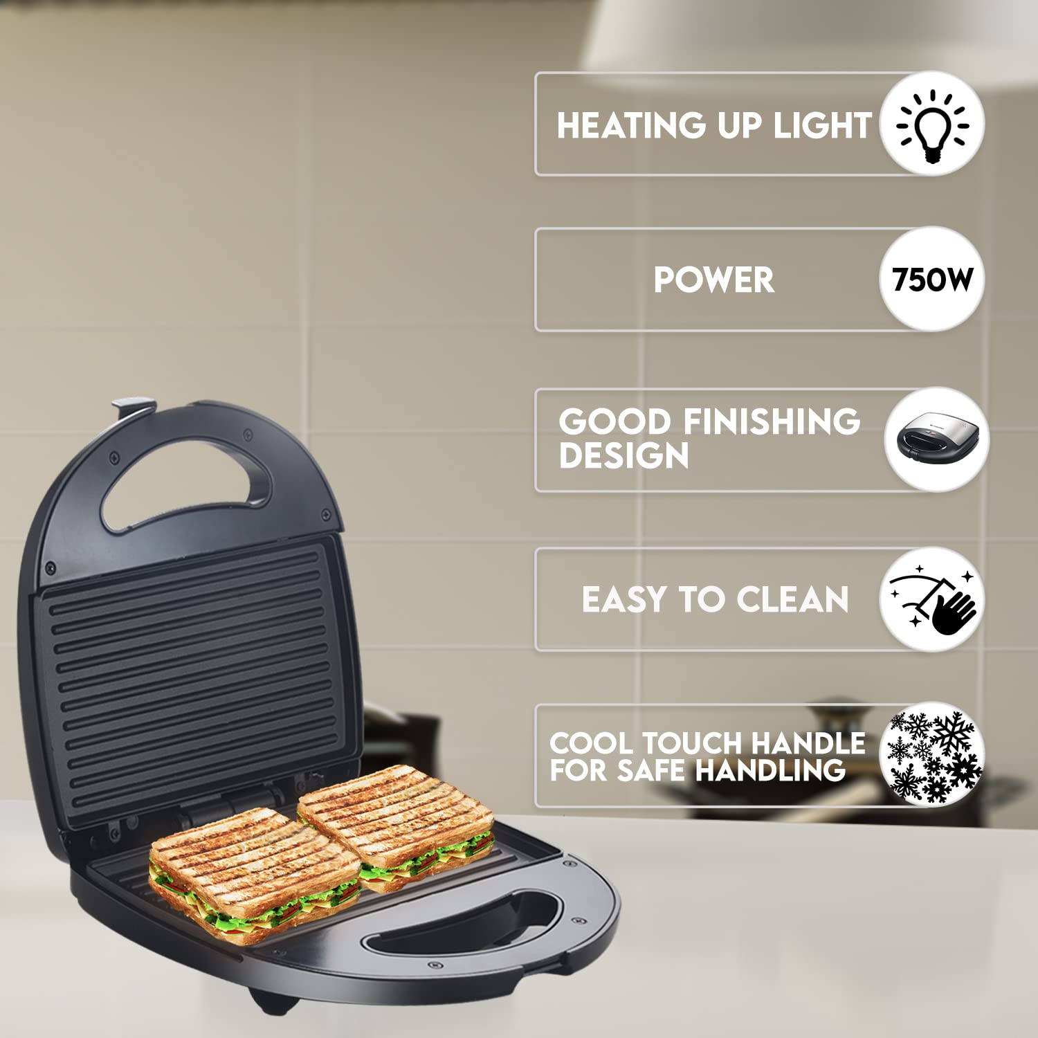 • Elegant black finish body; Non-stick plates provide a healthy low fat sandwich