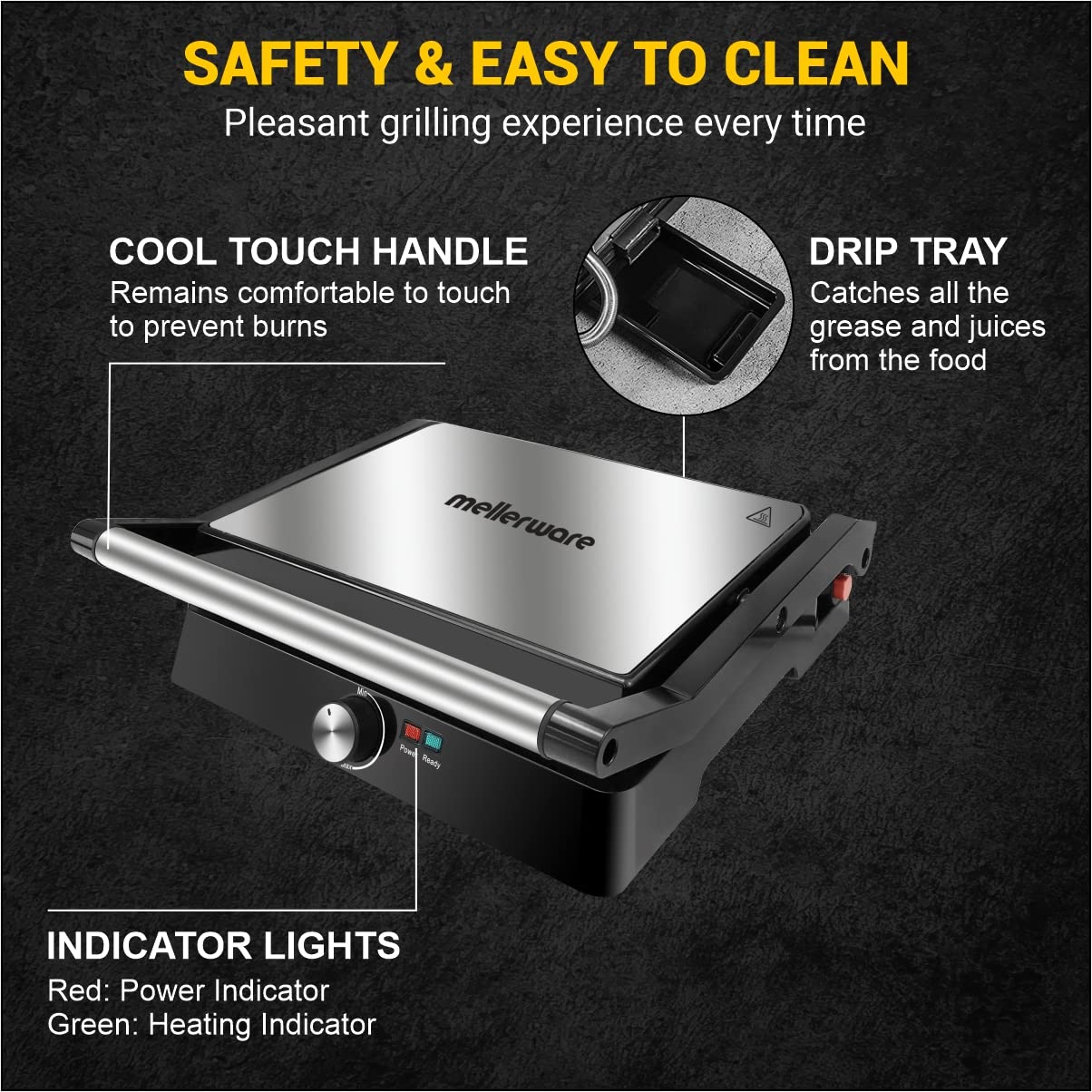 • USER FRIENDLY : It has a cool sliding touch handle for a better grip and Power & Ready to Cook Indicator Lights that indicates when the food is ready to serve
