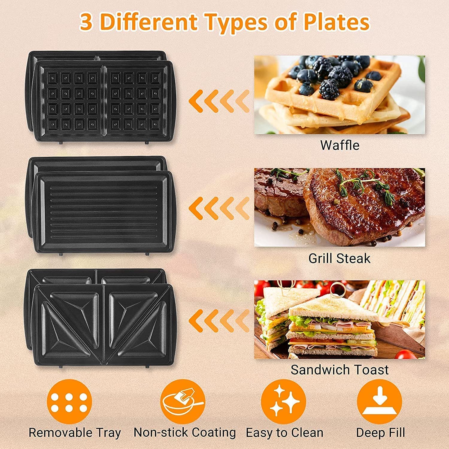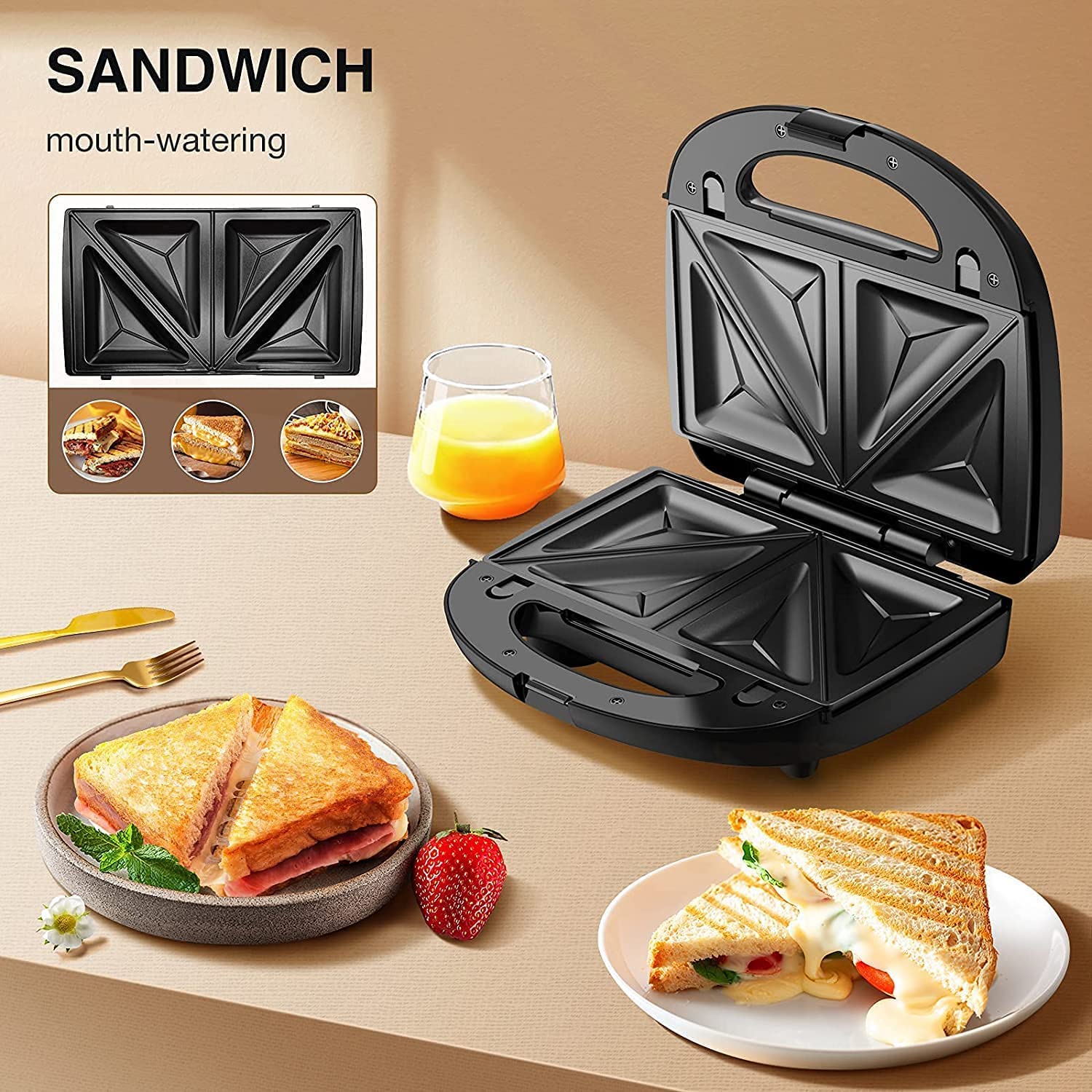 • 【3 in 1 sandwich maker】 This Sandwich toaster offers 3 removable non-stick plates. Perfect for sandwiches, waffles, grill cheese, American style sandwich toast, barbecue steaks, etc. The machine works well to make different DIY foods according to your preferences and allows you to have a different delicious breakfast everyday. It only takes three minutes to produce food without worrying about being late.