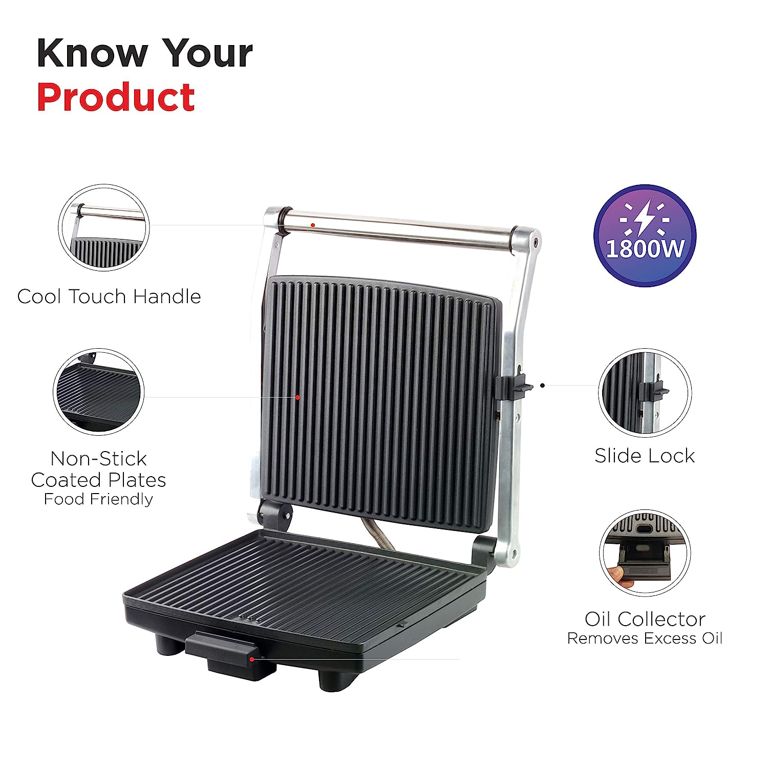 • New Arrival Warranty: 2 years;Power : 1800W ; Voltage: 220-240V, 50-60Hz ; Capacity 4 Slices; Power 1800 Watt helps to heat the plates to the maximum temperature that is needed for the grilling process