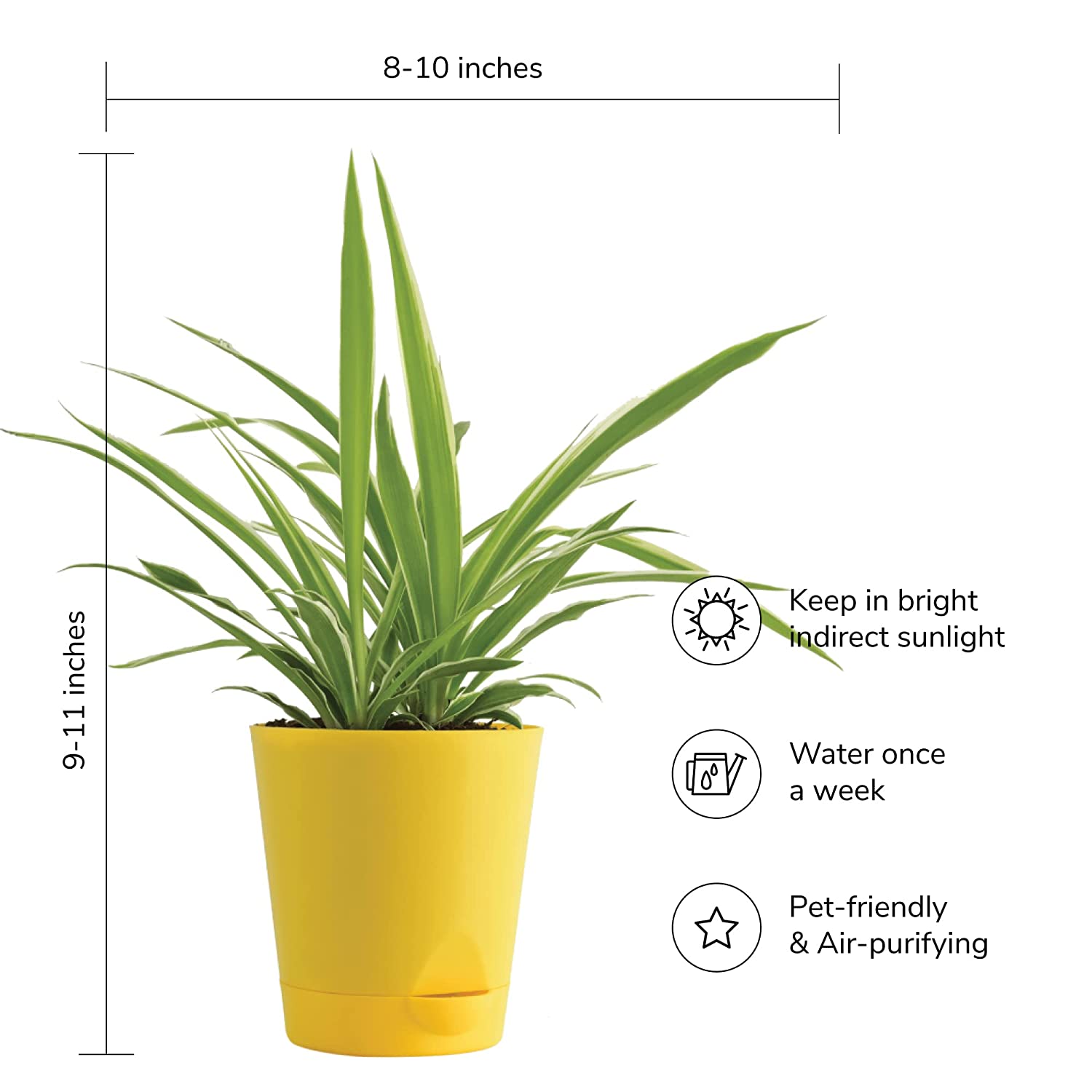 • Spider plant can grow in a wide range of conditions and suffers from very few problems, other than brown tips (under-watering is one reason). NASA study on “interior landscape plants for air pollution abatement” found spider plant helps in reducing Formaldehyde, Xylene and Toluene from the air.It is a shade-loving plant which is very easy to grow, low maintenance plant. Look best in hanging baskets or on tall stands to show off their trailing foliage when it grows up.