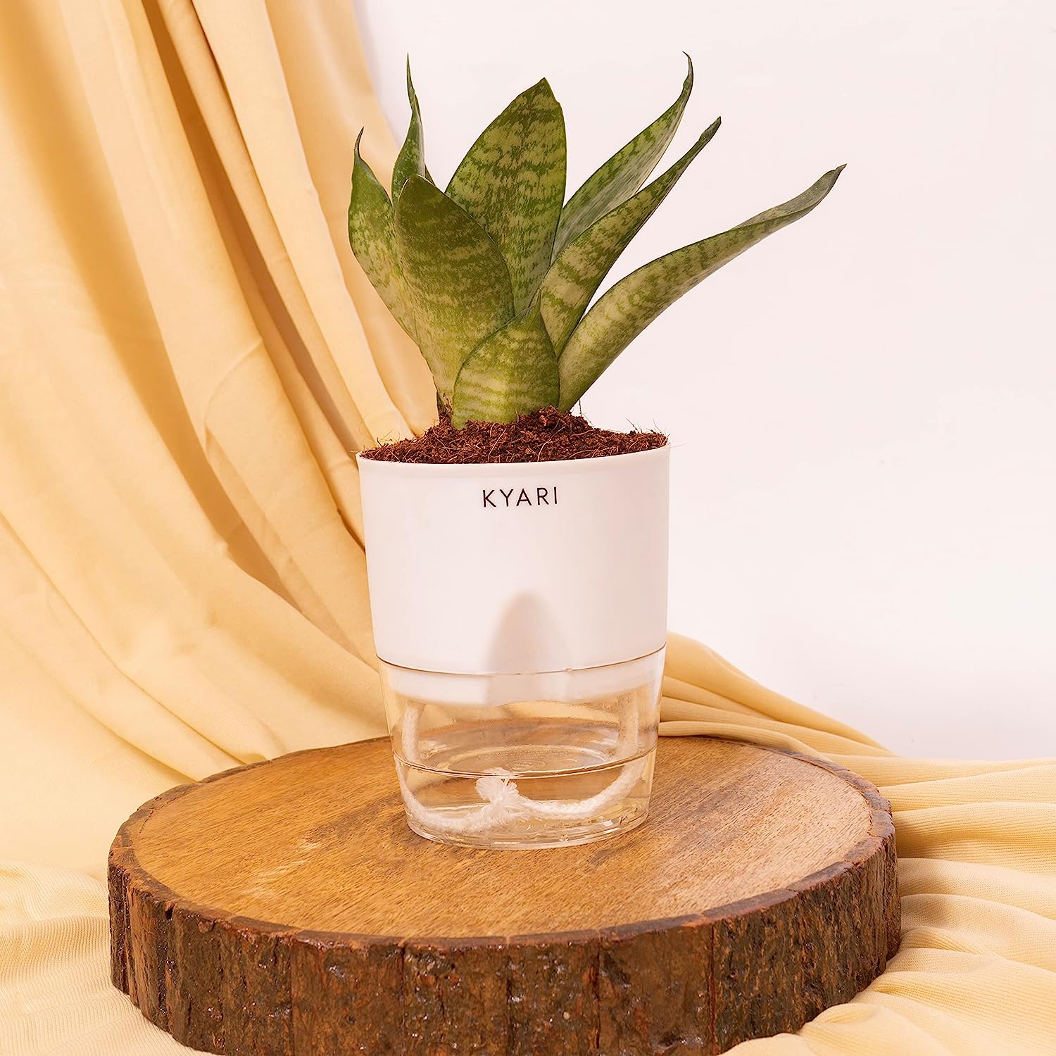 KYARI Sansevieria Green Snake Dracaena trifasciata Live Indoor Plant with White Self Watering Pot, Best for Living Room, Kitchen, Bedroom, & Office Table