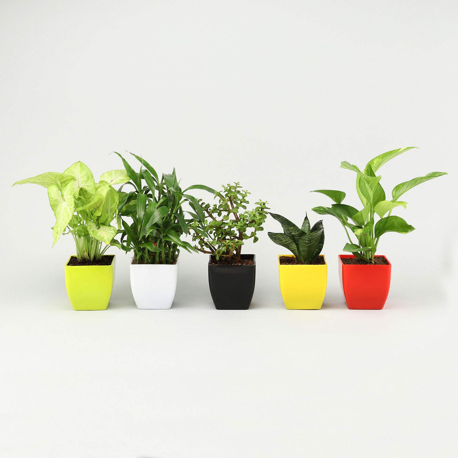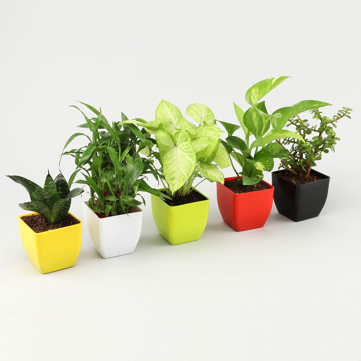 Ferns N Petals Combo Set of 5 Airpurifying Indoor Plants (Green Sansevieria Plant, 2-Layer Lucky Bamboo Plant, Jade Plant, Syngonium Plant, Money Plant) in Plastic Pot - Multicolor, 3 x 3 inches