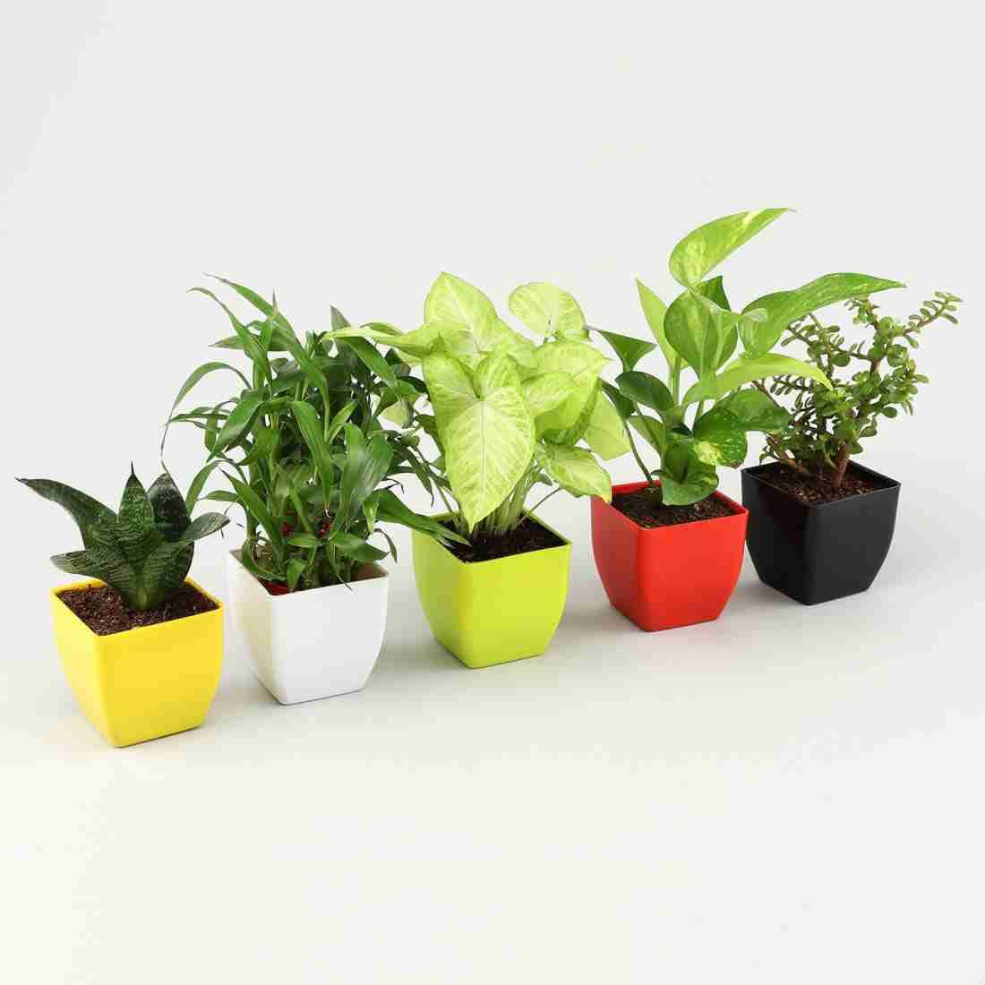 • Package Contains : Two Layer Bamboo Plant, Syngonium Plant, Sansevieria Plant, Jade Plant , Money Plant in Randorm color Plastic Pot