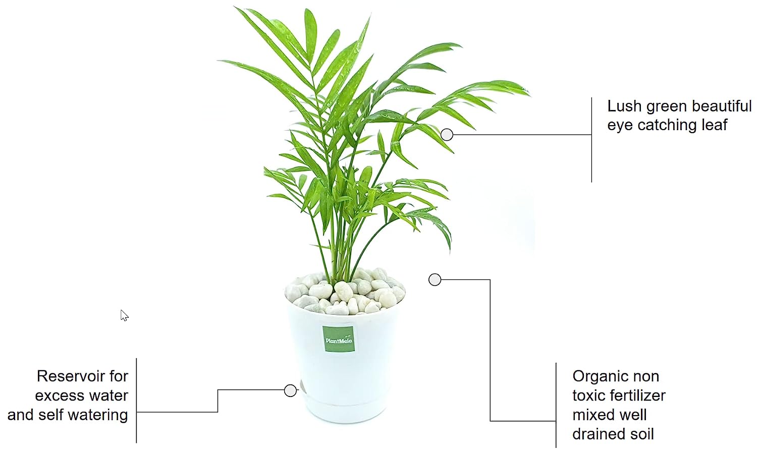 • Content: Live Chamaedorea Palm (Dwarf Areca Palm) Plant in self watering Pot ( pot colour as shown in picture), White Pebble, A detail caring instruction. Potting material used is organic soil.