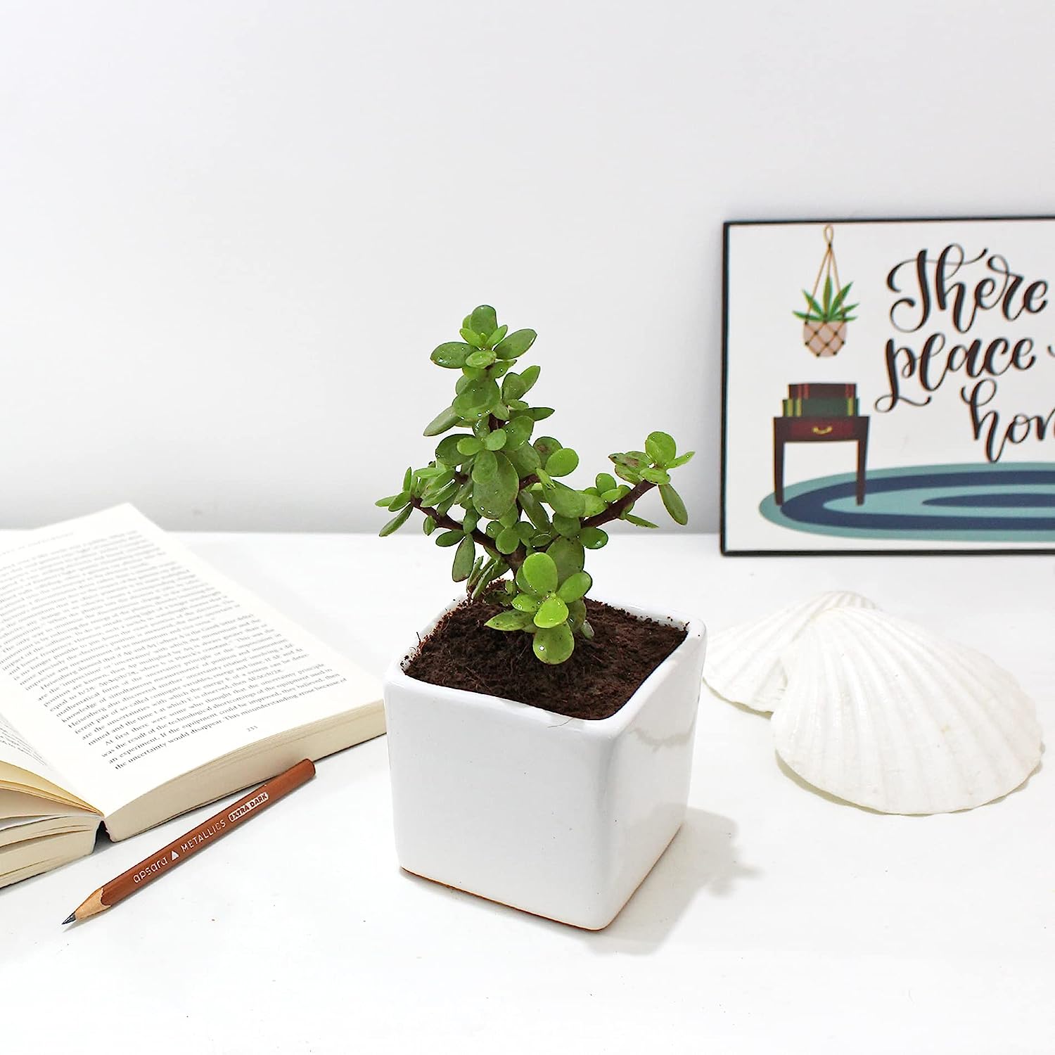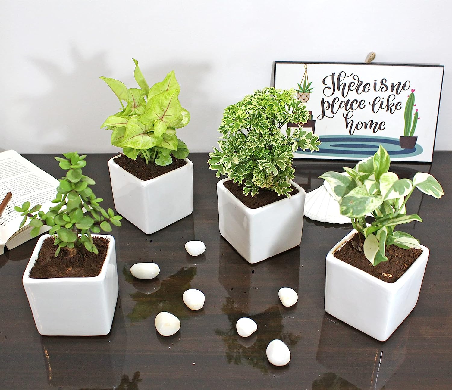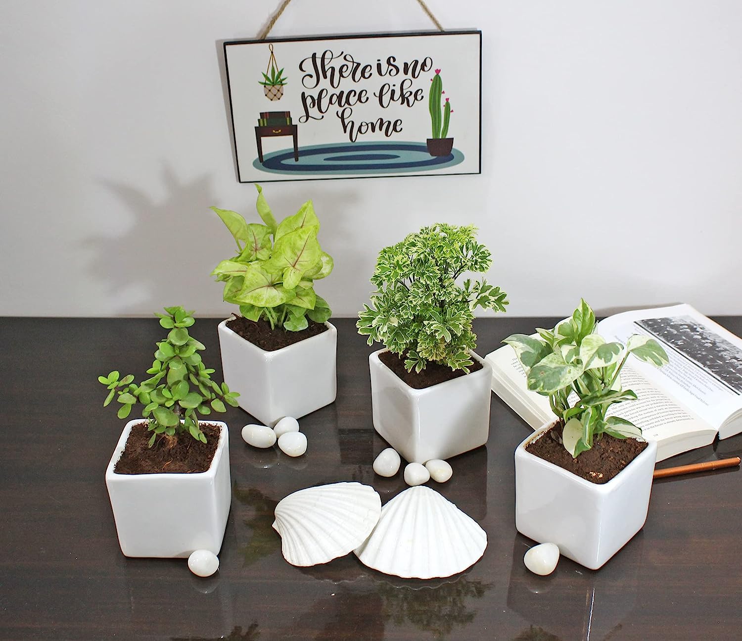 • 4 live and fresh hand picked top quality indoor plants in finest quality, glossy ceramic white square pots. Jade Plant, Aralia Plant, Green Syngnium Plant and Njoy Money Plant.