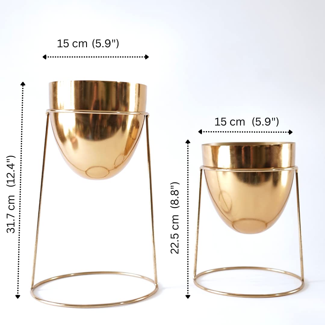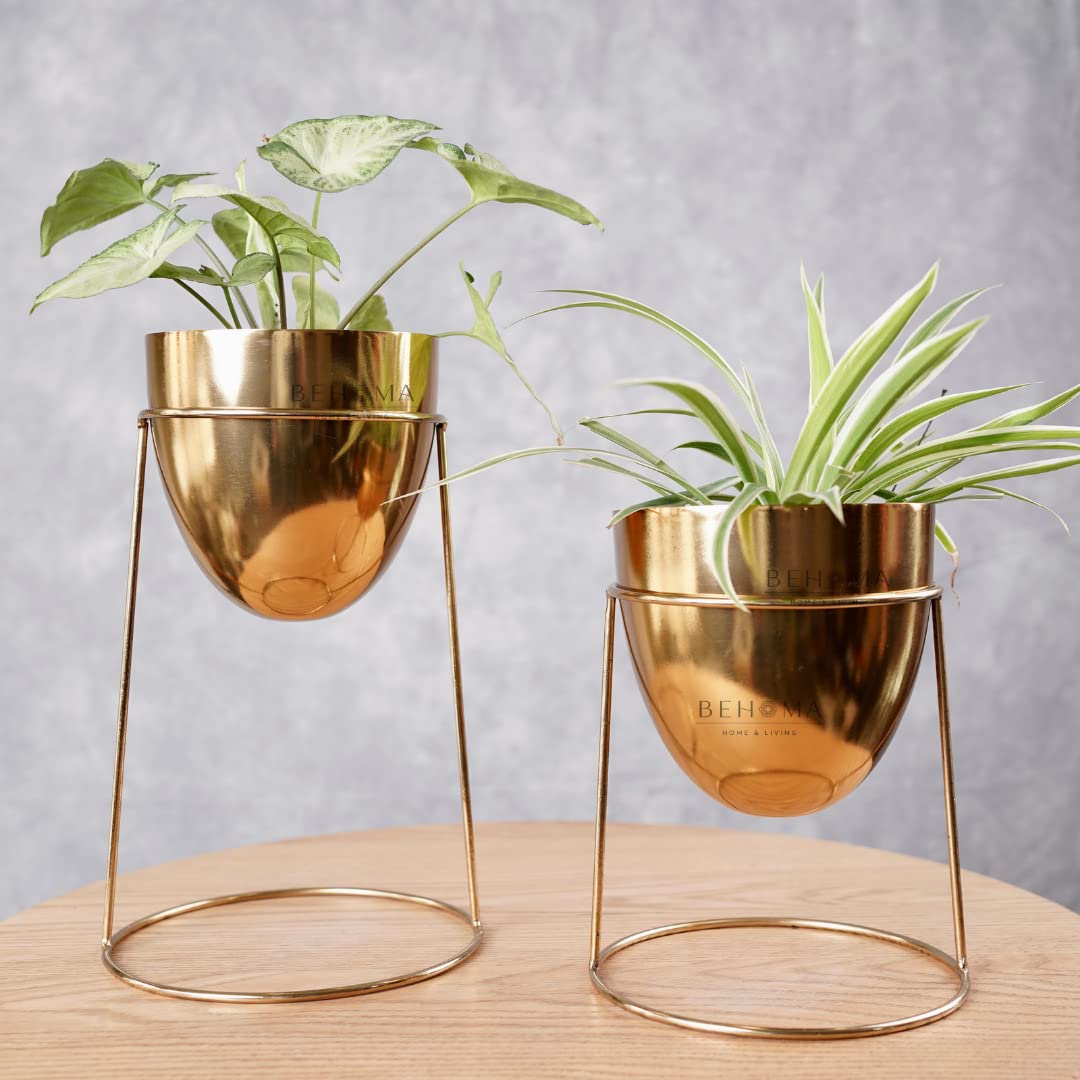 BEHOMA Golden Metal Planter with Round Gold Stand for Home Decoration | Planters for Living Room Badroom Office Interiors | Set of 2 (Plants not Included)
