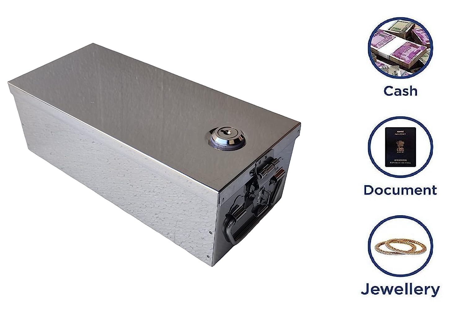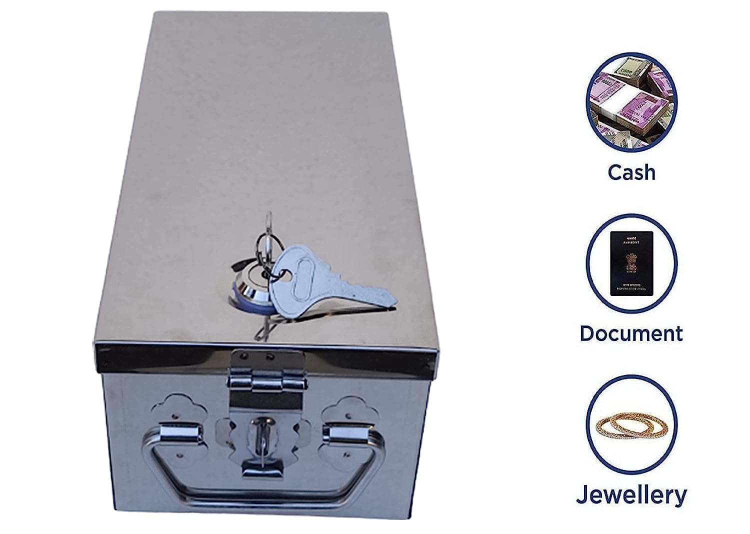 GinoSet® Stainless Steel Locker Boxes,Jewellery Boxes, Check book Box, Cash Box,Bank Locker Box, Peti Size - 8 Inch Cash Box (L-21cm, W-10cm, H-8cm)(With Pre fited Lock & 2 Key)