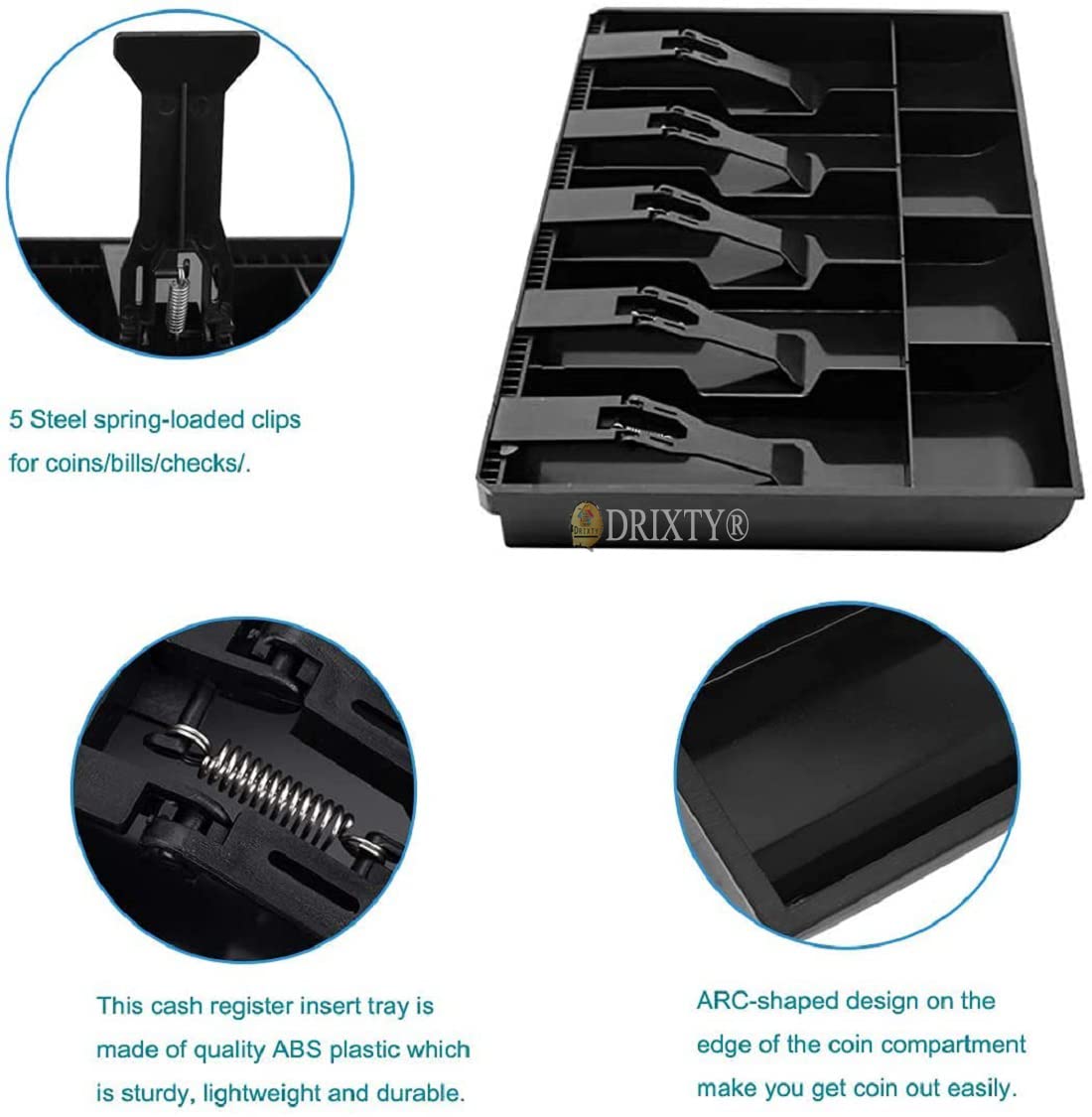 • Easy to clean: The DRIXTY Cash Tray is easy to clean and sanitize, helping to maintain a hygienic cash handling environment.