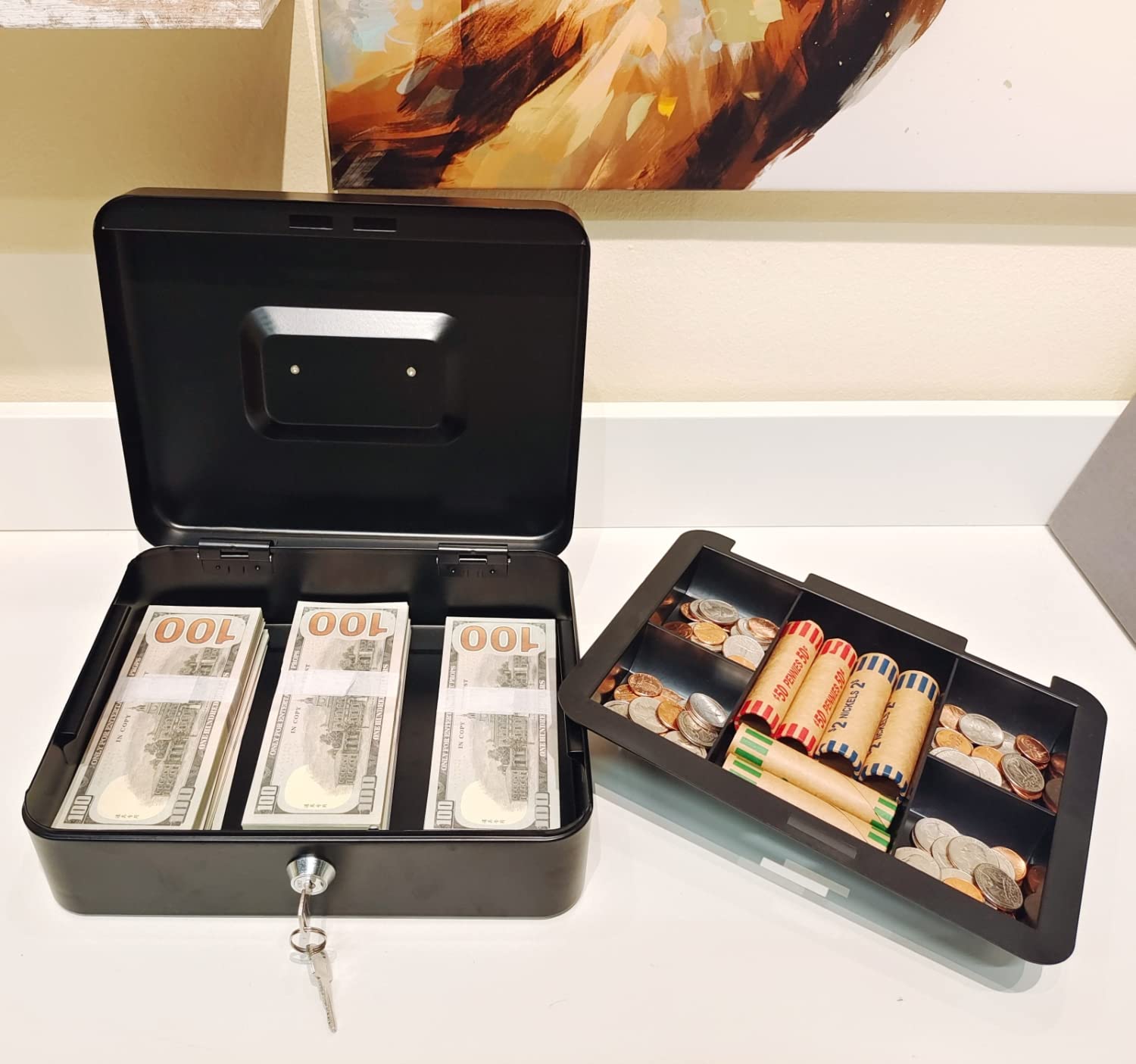 Cash Box with Money Tray and Key Lock Large Security Box Metal Safe Box for Money 9.84 x 7.87 x 3.54 Inches Black