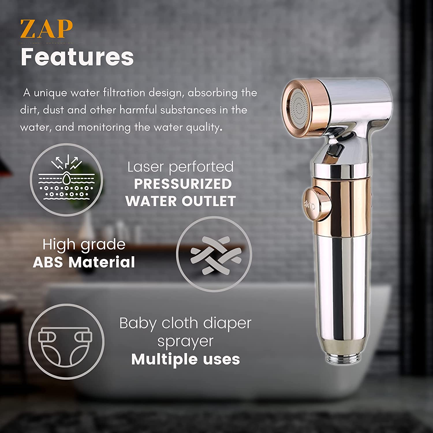 • QUALITY AND MATERIAL: Zap Health Faucet is made of ABS material, this handgun sprayer can take regular to high water flow pressure unlike ABS OR PVC body health Faucet. This comes with High Grade Stainless Steel Tube/Hose and clutch. The bidet sprayer is made for regular usage and has a vintage design to elevate your bathroom sanitation and fittings.It can be used as a garden sprayer and hand shower as well.