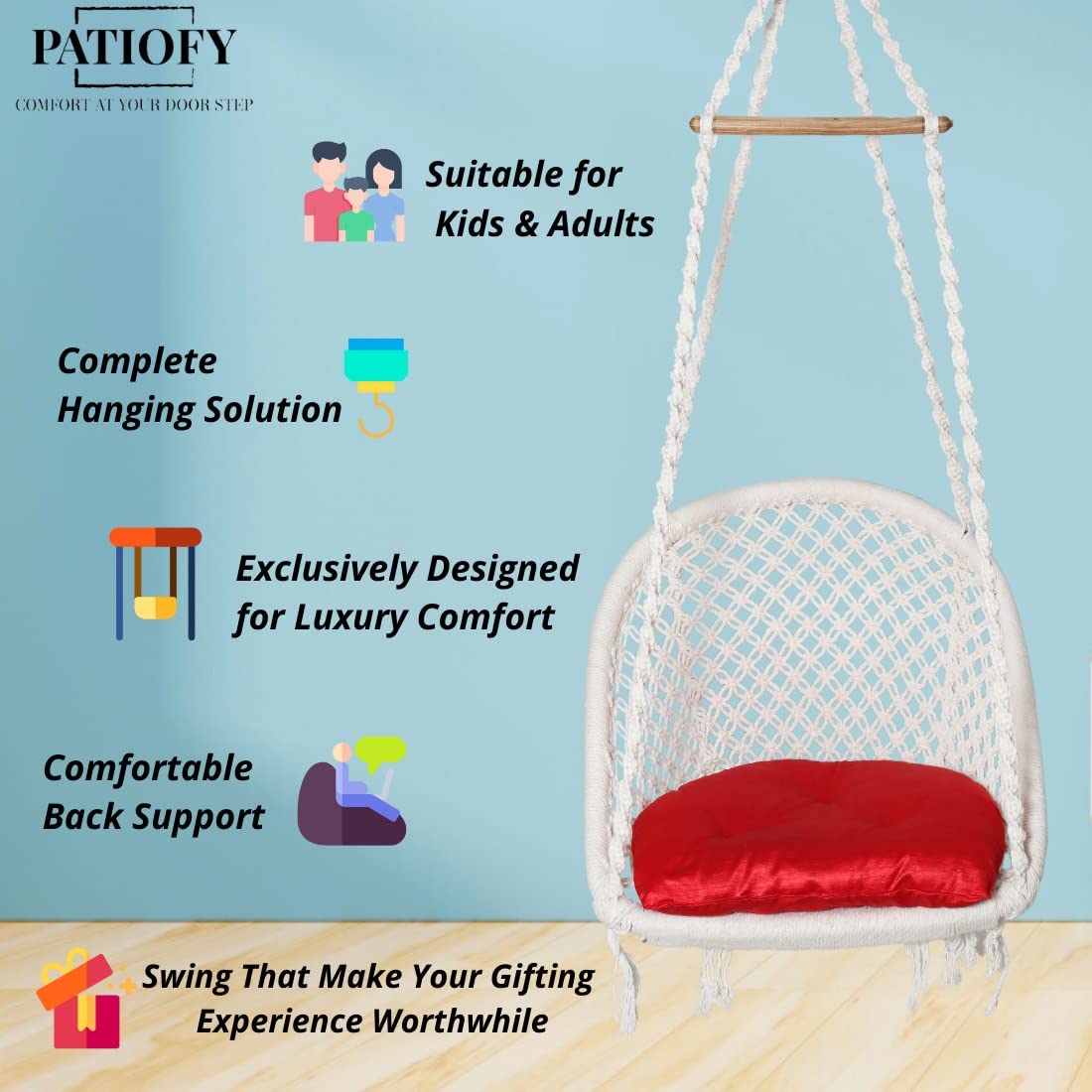• SPACIOUS COMFORTABLE SWING CHAIR: This swing chair has a strong load-bearing capacity, which can support up to 100 Kgs; The size of the jhula chair is Length: 24 Inches, Breadth: 25 Inches, Full Height: 60 Inches, which can be used comfortably by kids & adults. Color: White Swing for Garden, Swing Shape: D-shaped cotton hanging swing chair is portable & durable with a free comfortable cushion.