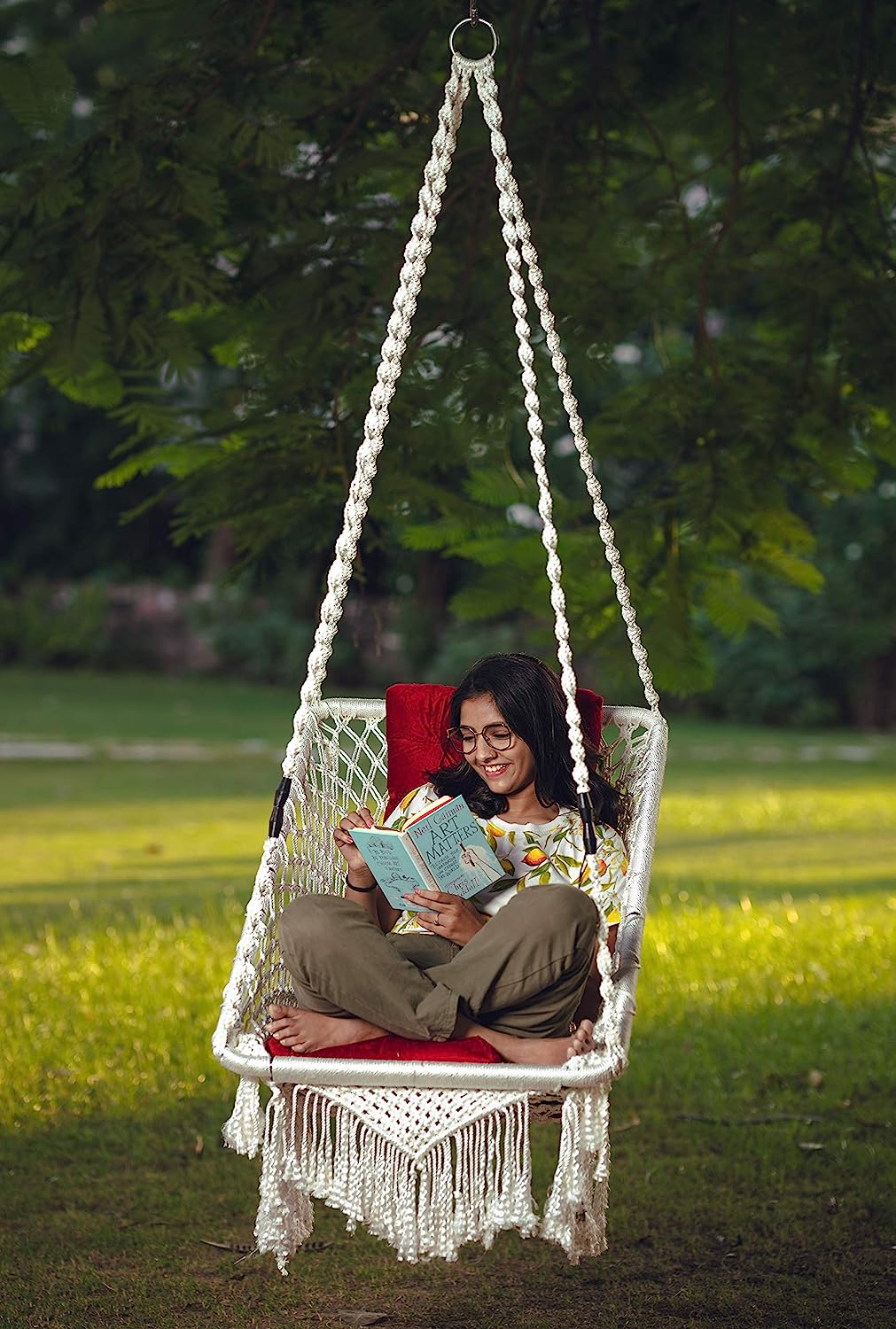 • PRODUCT SPECIFICATIONS: Built with strong and durable cotton rope with extra thickness for maximum stability and comfort, the entire swing measures at Length: 36", Breadth: 26", Full Height: 66", Weight-bearing capacity 150 Kgs, Color: White Swing with Red Square Cushion, Swing Shape: Rectangle Shape.
