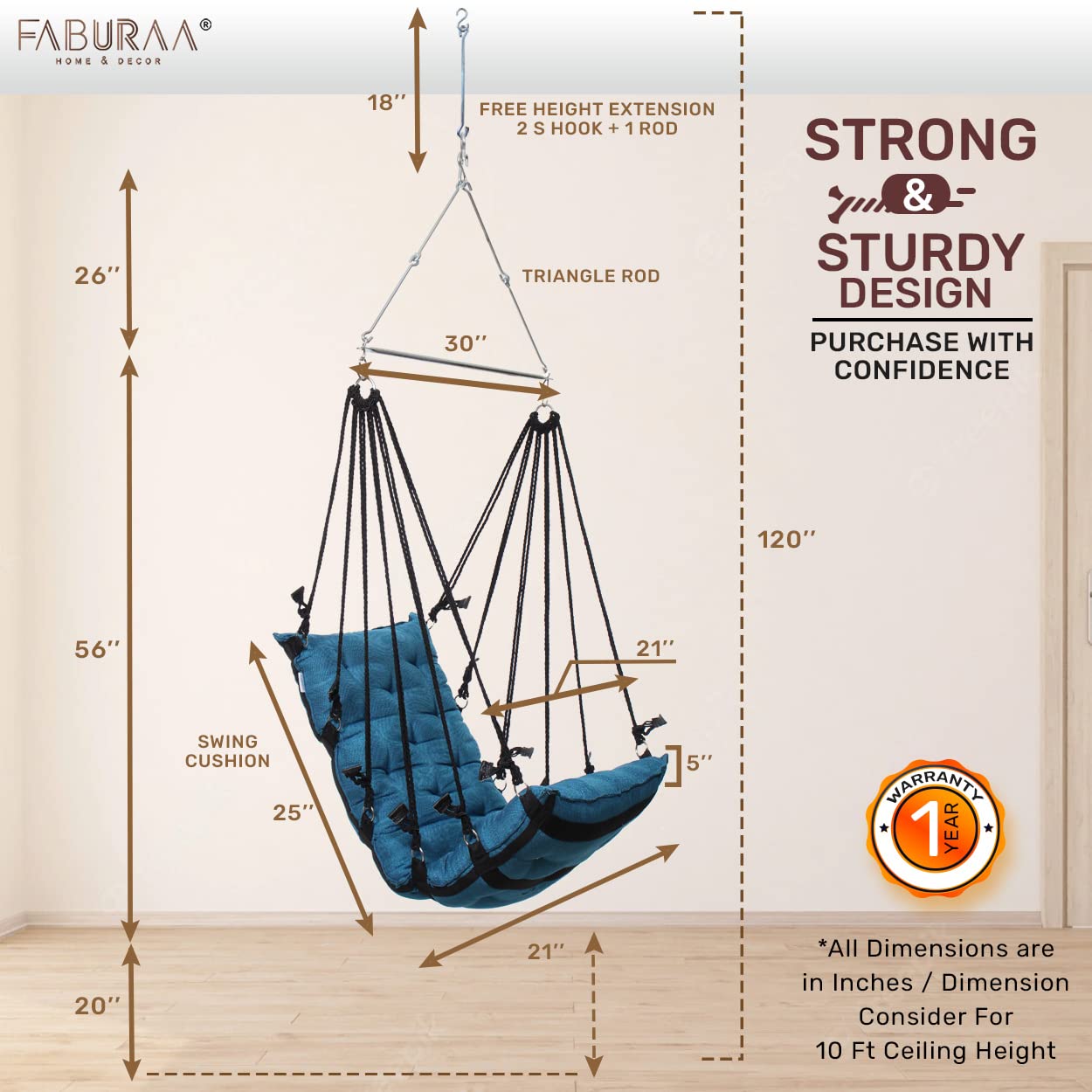 • ULTRA COMFORTABLE & STYLISH DESIGN – Faburaa Swing for Adult is Comfortable for Back. Unlike Other Small Sized Hanging Chairs Grande Jhula for Adults has Biggest in Class Back Height of 32 Inches. Even Tall People Can Enjoy Faburaa Grande Swing Chair. Dimensions of Grande Swing Chair is - 25" × 21" (Back), 21" x 21" (Base). These swings for adults are Made in India and Filled with 100% Soft Cotton Material. We are Giving Free Accessories in Package.