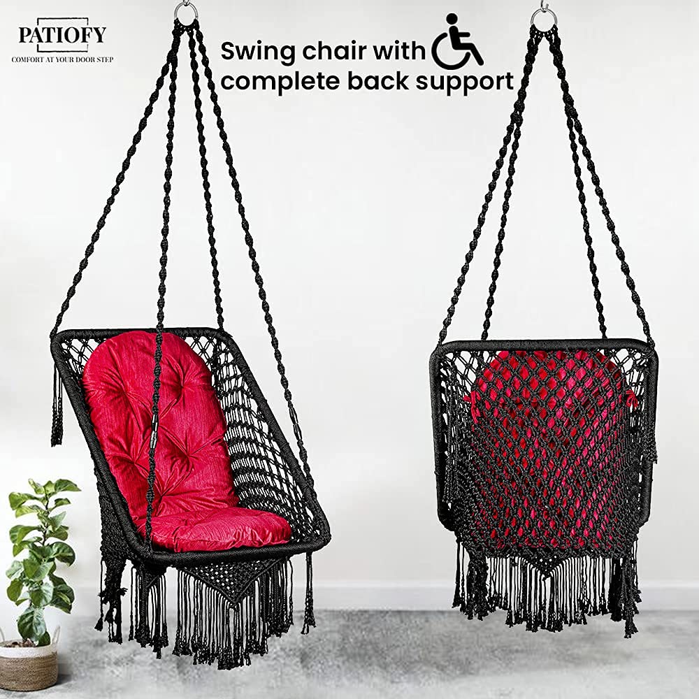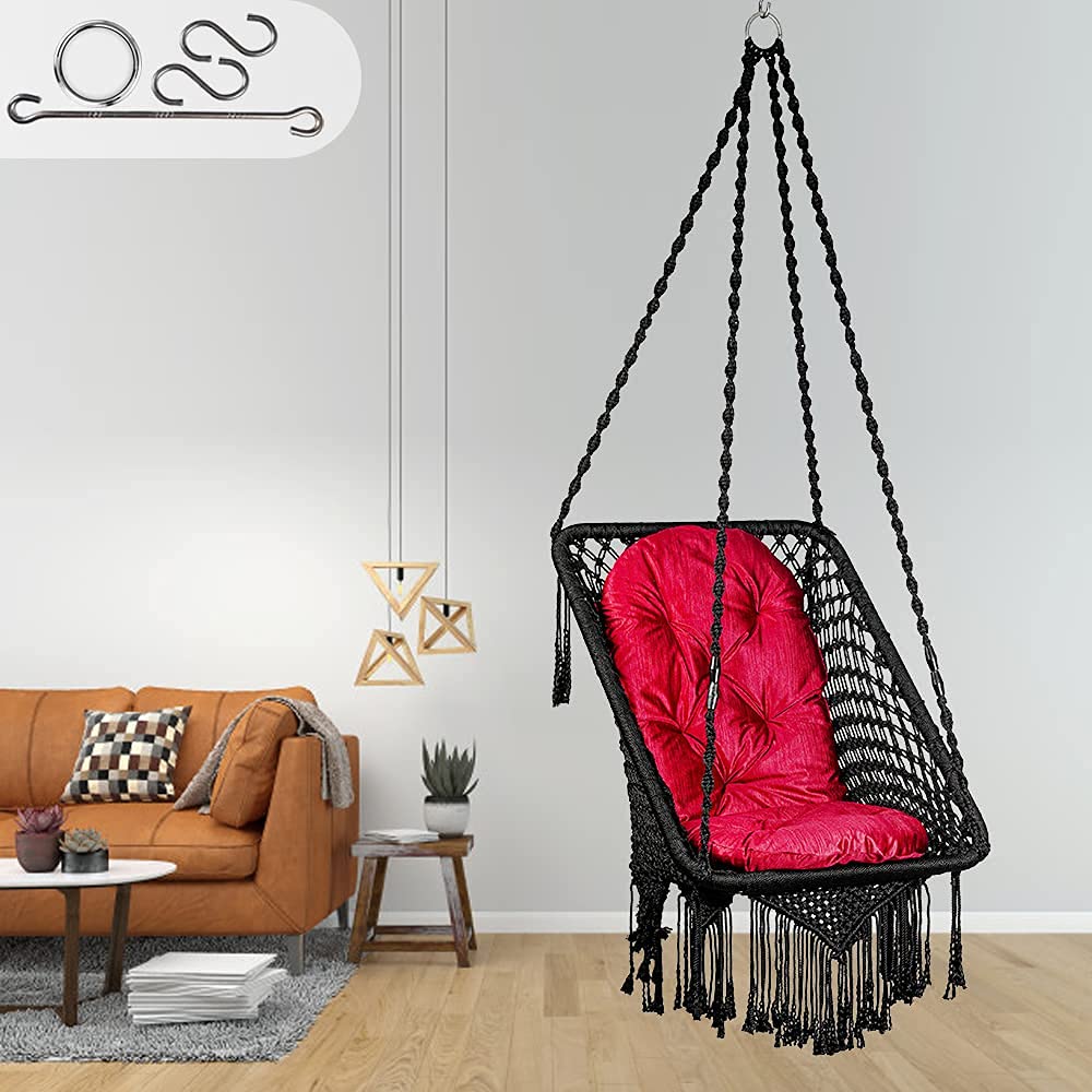 • PRODUCT SPECIFICATIONS: Built with strong and durable cotton rope with extra thickness for maximum stability and comfort, the entire swing measures at Length: 36", Breadth: 26", Full Height: 66", Sitting Depth: 19", Cushion Length: 34" and Breadth: 16", Weight-bearing capacity 150 Kgs, Color: Black Swing with Red Cushion, Swing Shape: Square.