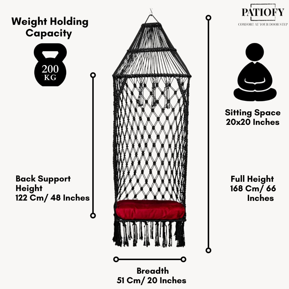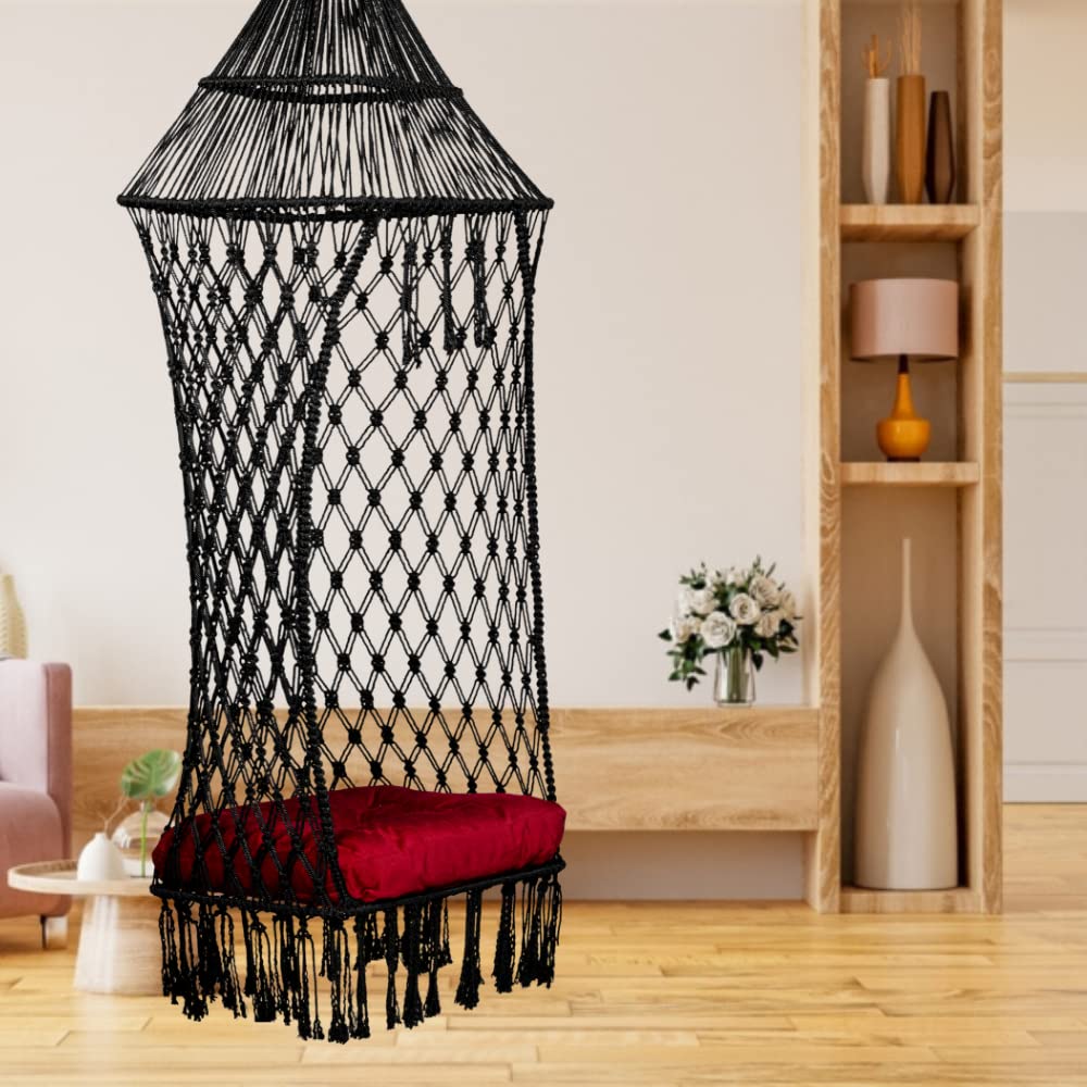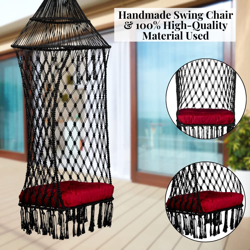• SPACIOUS COMFORTABLE HANGING SWING CHAIR: This premium swing chair has a strong load-bearing capacity, which can support up to 200 Kgs; The size of the swing is Back Support: 48 Inches, Breadth: 20 Inches, Full Height: 66 Inches, Sitting Space: 20 x 20 Inches, Color: Black Swing for Garden with Red Sitting Cushion.