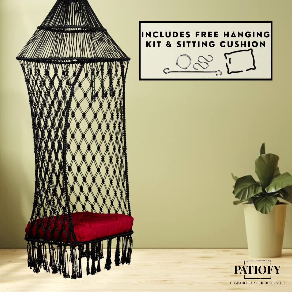 • PATIOFY COMFORT KING SWING: This stylish swing chair with cushion is very cozy & durable. This swing chair is best for relaxing at home allows you to enjoy soft sponge comfort anytime & anywhere. This premium hanging jhula is the standard size & comfortable. Handmade bohemian-style swing with macrame net chair pattern and tassels add a unique touch to your place. Lay back & relax as you enjoy this roomy, soft & extra-comfortable hammock swing chair.