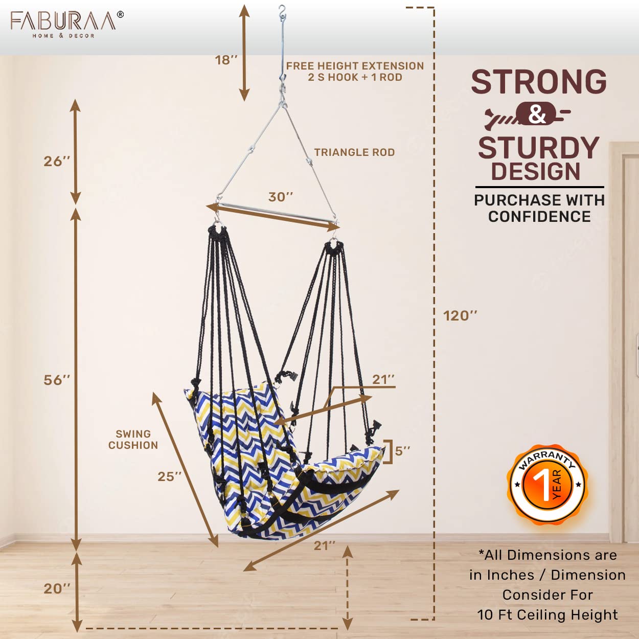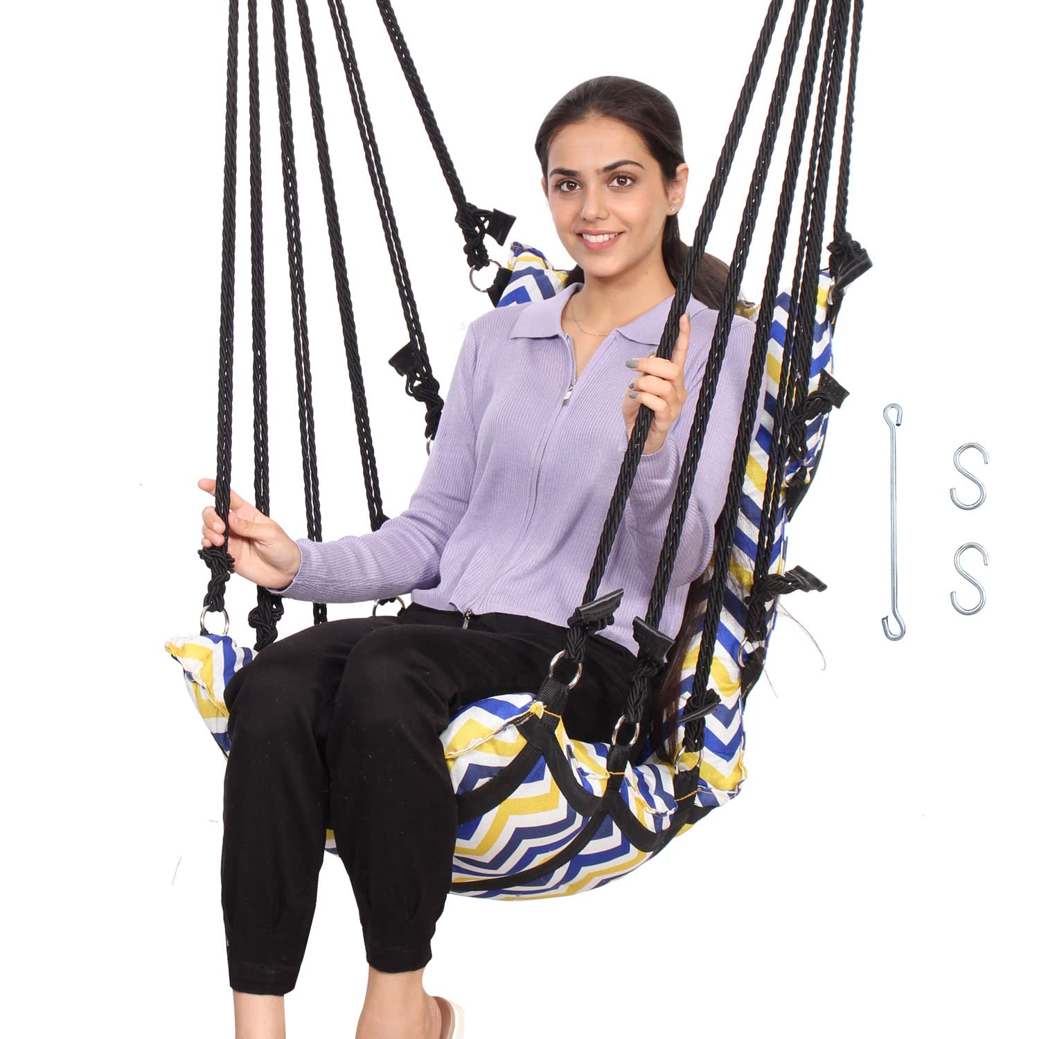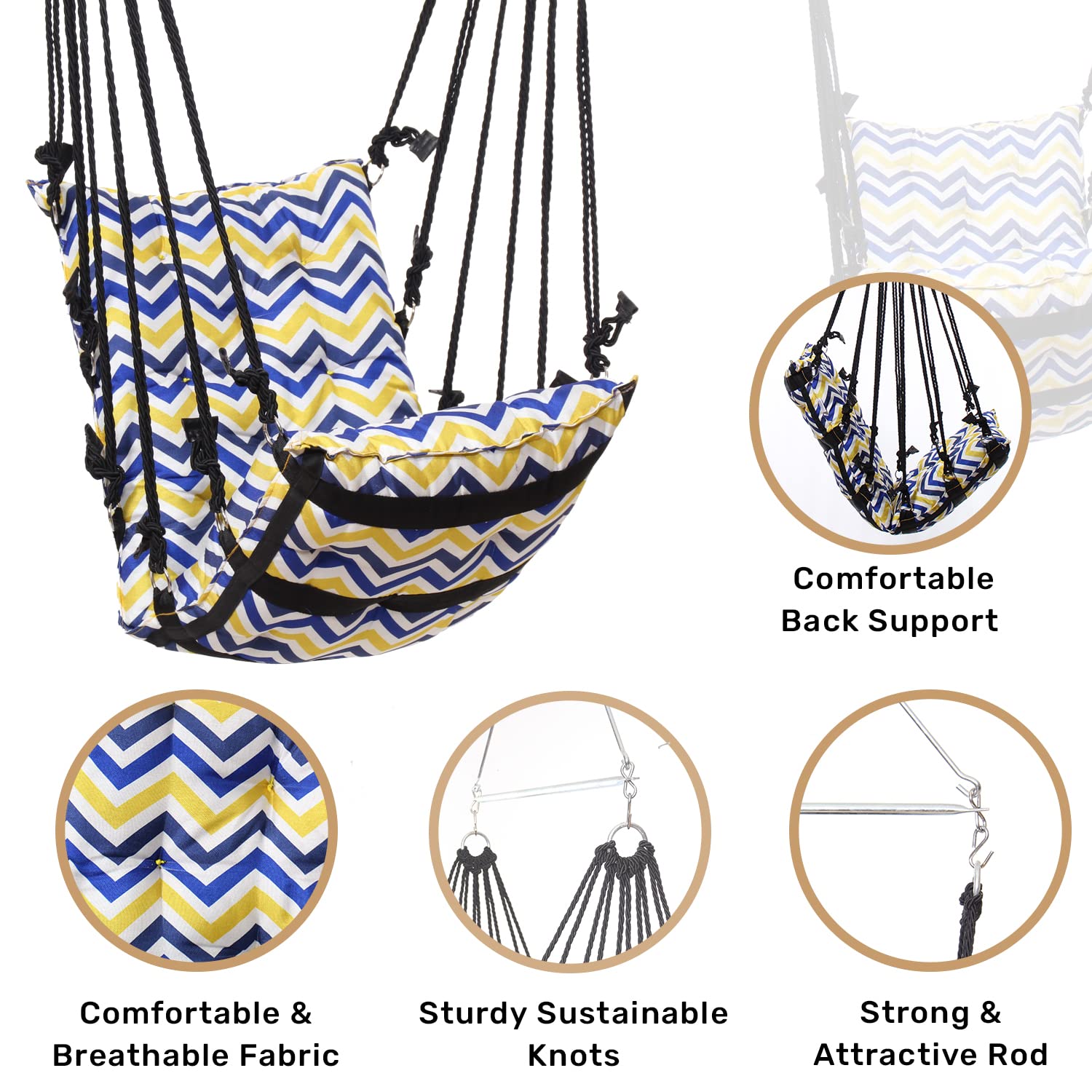 FABURAA Jhula for Adults Balcony, Swing for Balcony, Hammock Swing for Adults, Free Hanging Accessories (Exotica Chevron Blue & Yellow Design, Weight Capacity - 150Kg)