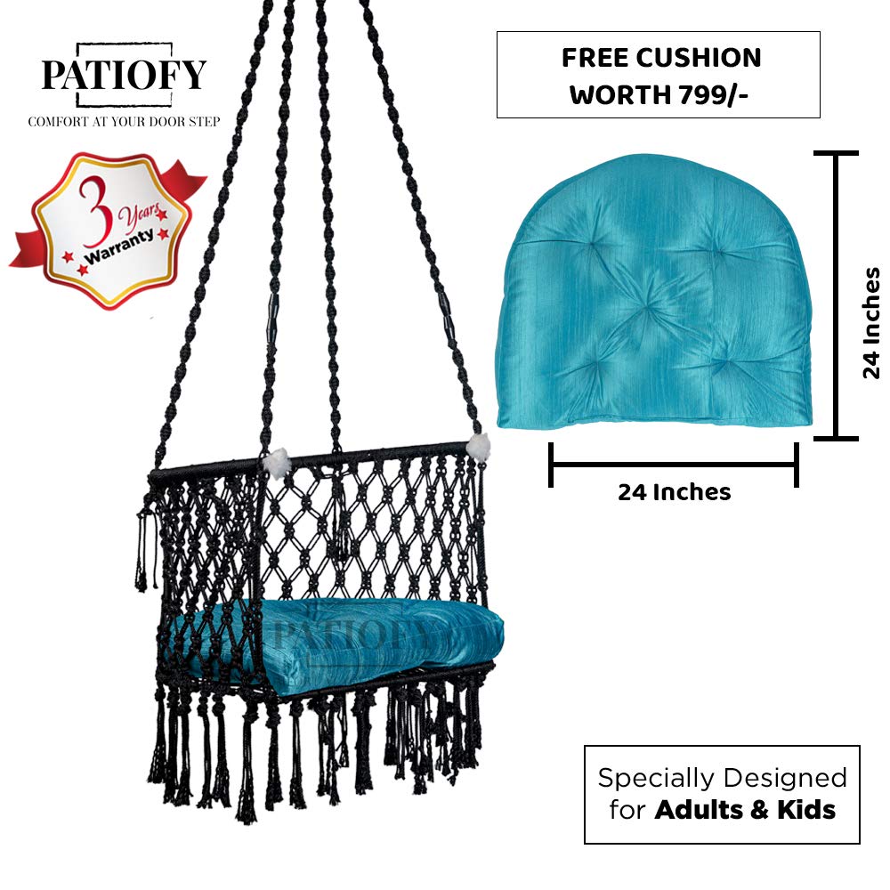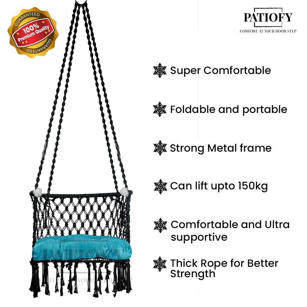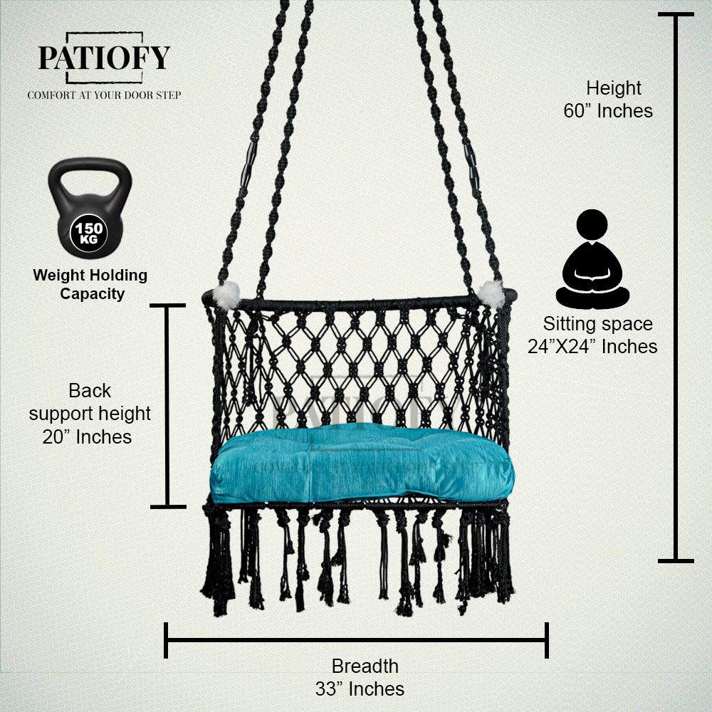 • SWING CHAIR PRODUCT SPECIFICATIONS: Built with strong and durable cotton rope with extra thickness for maximum stability and comfort, the entire swing measures at Length: 33", Breadth: 33", Full Height: 60", Sitting Depth: 24", Cushion Length: 24" and Breadth: 24", Weight-bearing capacity 150Kgs, Color: Black Swing with Blue Cushion, Swing Shape: C- Shape.