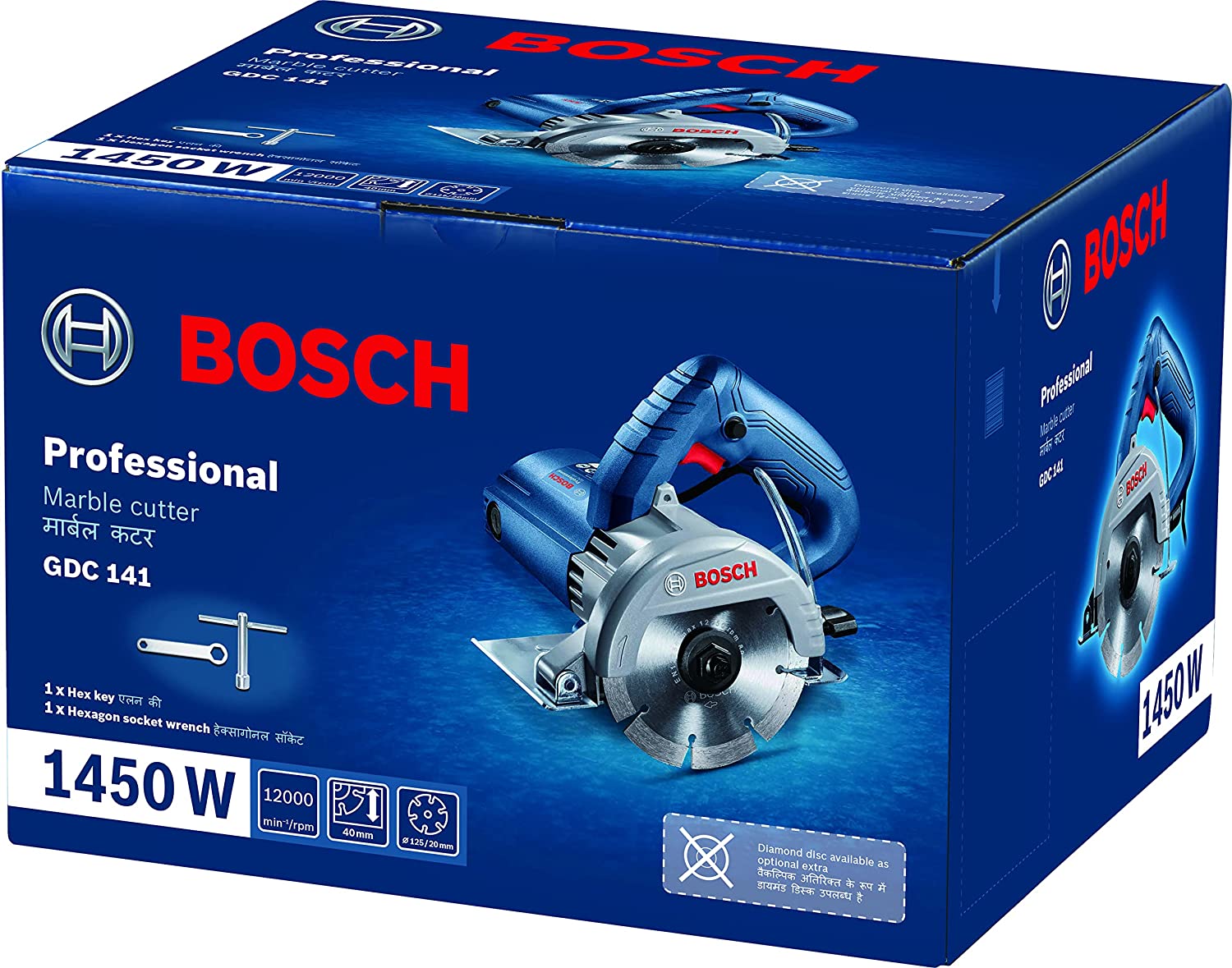 Bosch GDC 141 Corded Electric Diamond Tile/Marble Cutter, 1,450W, 125 mm Disc Dia, 12,000 rpm, Double Insulation, Overload Capacity, 3 kg + Hex Key & Hexagon Socket Wrench, 1 Year Warranty