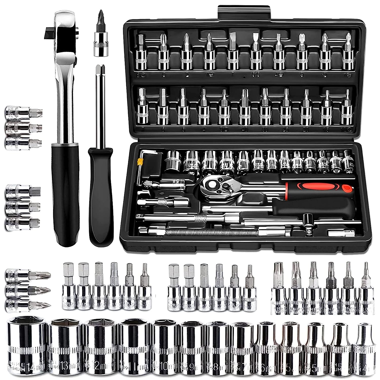 Quicknik Tool Kit 46-Piece 1/4-inch Screwdriver Drive Socket Wrench Set Ratchet Mechanic Tools Kit Bit Sockets with Extension Bar for Automotive Repair& Household, Metric with Storage Case For Travel