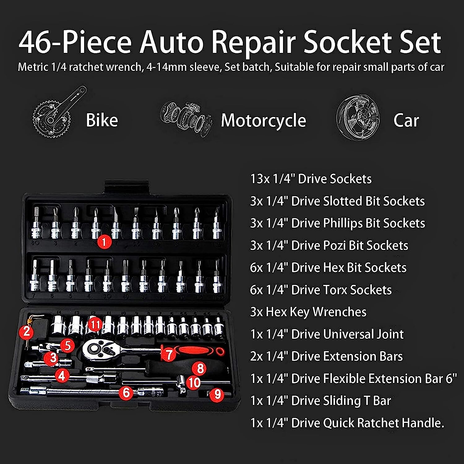 • ✅ 【THE 17 PCS】- 13 Pcs 1/4" Hex Metric socket: 4-4.5-5-5.5-6-7-8-9-10-11-12-13-14MM; 3 Pcs L Allen Wrench:1.5-2-2.5MM;1 Pcs 1/4" universal joint, 1 Pcs 1/4" flexible extension bar, 2 Pcs 1/4" extension bar(50MM,100MM), 1 Pcs 1/4" slide T Bar, 1 Pcs 1/4" quick-release ratchet, 1 Pcs 6" spinner handle, 1 Pcs Bit adaptor, 1 Pcs Blow Tool box
