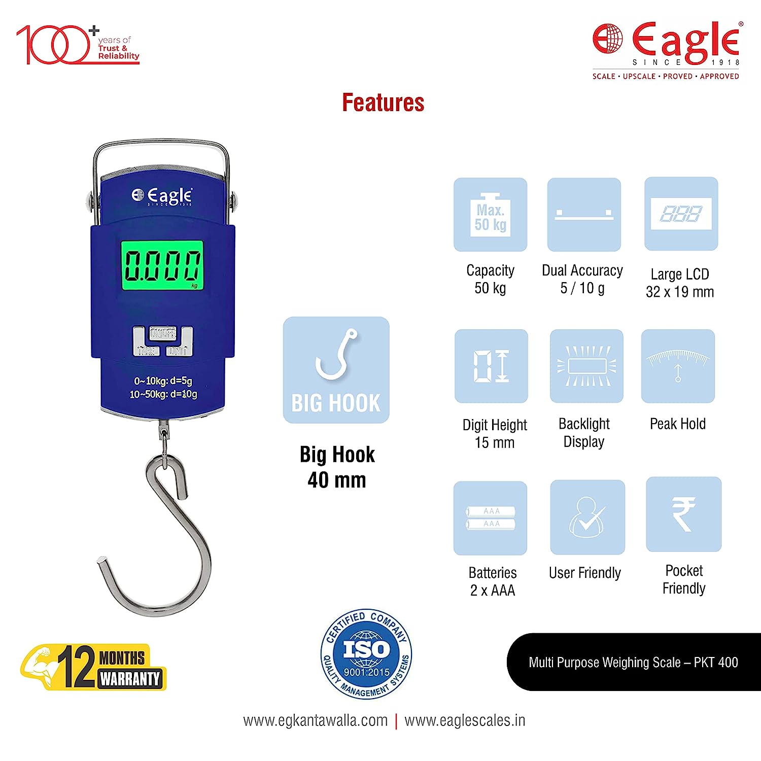 • * 50 kg weight capacity: Eagle Digital luggage weight machine have 50 kg maximum weighing capacity with high precision accuracy in two modules Upto 10 kg is 5 g & above 10 kg is 10 g. Long life AAA battery included in this bag weighing scale for luggage, baggage for accurate weight hold the hands steady and parallel to ground; for weight above 10 kgs please use both hands. * Easy to read reading even in dark areas with a green display backlight.