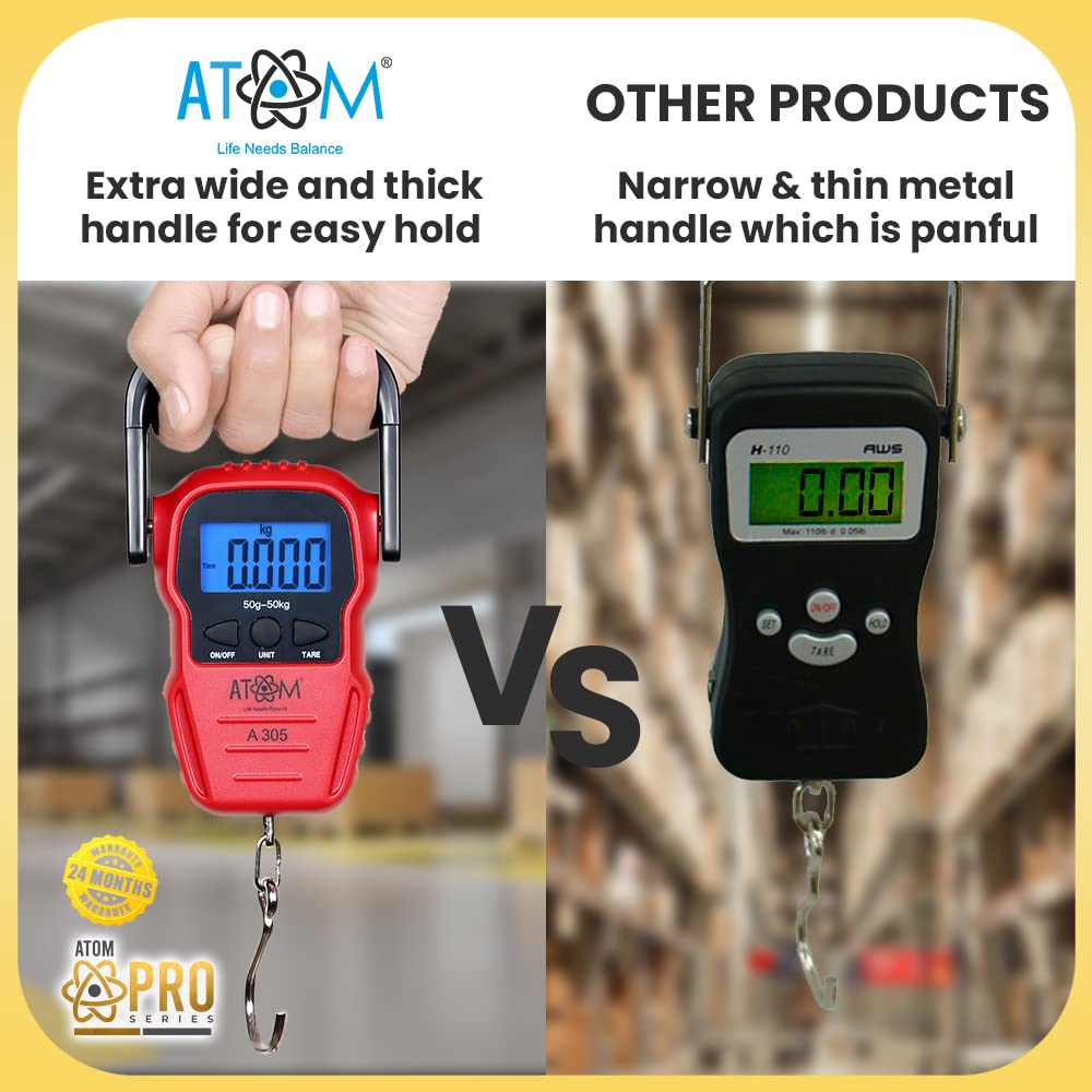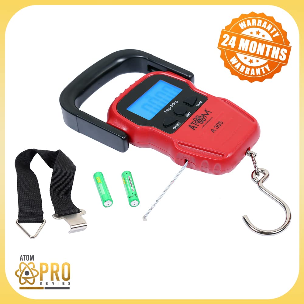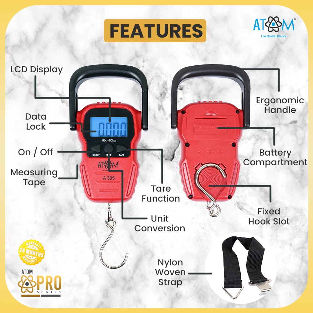 Atom A 305 hanging weight machine-easy to hold wide soft handle 50 kg extra strap and pouch included portable digital weighing scale for gas cylinder luggage suitcase and bag for flight and travel